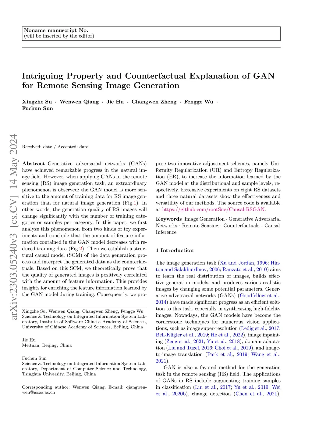Generative adversarial networks (GANs) have achieved remarkable progress in the natural image field. However, when applying GANs in the remote sensing (RS) image generation task, an extraordinary phenomenon is observed: the GAN model is more sensitive to the size of training data for RS image generation than for natural image generation. In other words, the generation quality of RS images will change significantly with the number of training categories or samples per category. In this paper, we first analyze this phenomenon from two kinds of toy experiments and conclude that the amount of feature information contained in the GAN model decreases with reduced training data. Then we establish a structural causal model (SCM) of the data generation process and interpret the generated data as the counterfactuals. Based on this SCM, we theoretically prove that the quality of generated images is positively correlated with the amount of feature information. This provides insights for enriching the feature information learned by the GAN model during training. Consequently, we propose two innovative adjustment schemes, namely Uniformity Regularization (UR) and Entropy Regularization (ER), to increase the information learned by the GAN model at the distributional and sample levels, respectively. We theoretically and empirically demonstrate the effectiveness and versatility of our methods. Extensive experiments on three RS datasets and two natural datasets show that our methods outperform the well-established models on RS image generation tasks. The source code is available at https://github.com/rootSue/Causal-RSGAN.