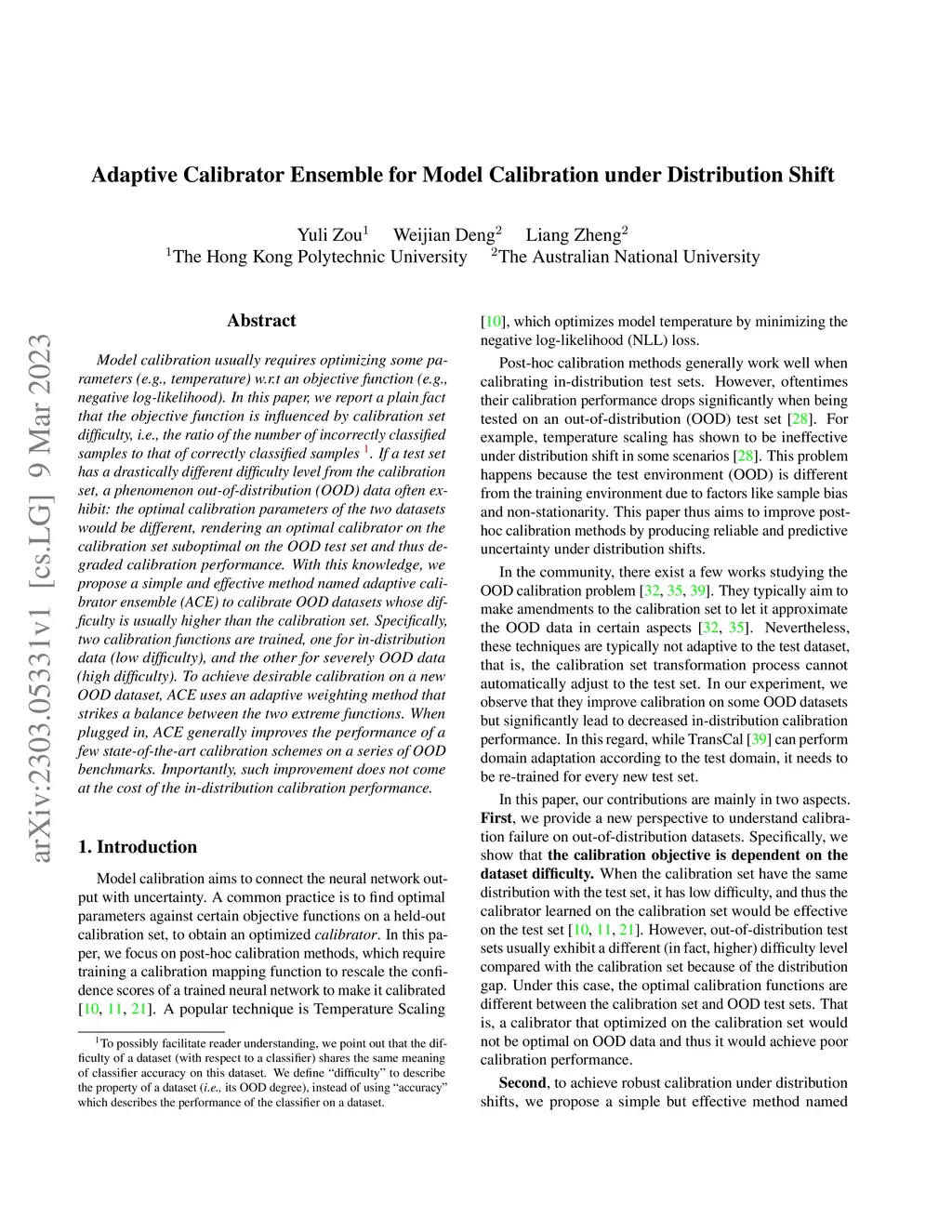 Model calibration usually requires optimizing some parameters (e.g., temperature) w.r.t an objective function (e.g., negative log-likelihood). In this paper, we report a plain, important but often neglected fact that the objective function is influenced by calibration set difficulty, i.e., the ratio of the number of incorrectly classified samples to that of correctly classified samples. If a test set has a drastically different difficulty level from the calibration set, the optimal calibration parameters of the two datasets would be different. In other words, a calibrator optimal on the calibration set would be suboptimal on the OOD test set and thus has degraded performance. With this knowledge, we propose a simple and effective method named adaptive calibrator ensemble (ACE) to calibrate OOD datasets whose difficulty is usually higher than the calibration set. Specifically, two calibration functions are trained, one for in-distribution data (low difficulty), and the other for severely OOD data (high difficulty). To achieve desirable calibration on a new OOD dataset, ACE uses an adaptive weighting method that strikes a balance between the two extreme functions. When plugged in, ACE generally improves the performance of a few state-of-the-art calibration schemes on a series of OOD benchmarks. Importantly, such improvement does not come at the cost of the in-distribution calibration accuracy.