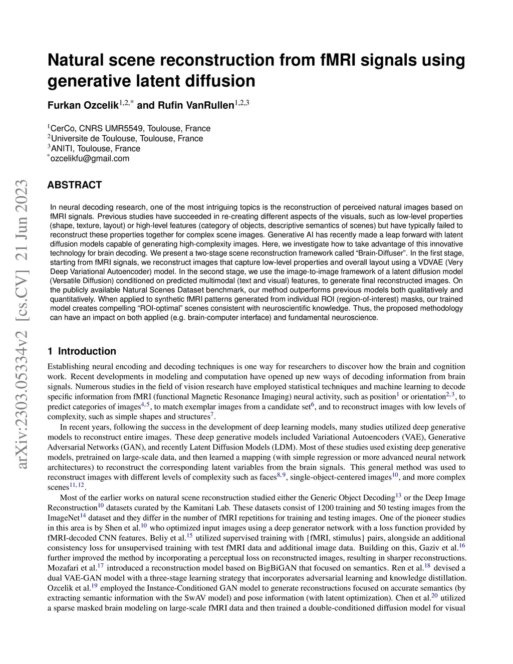 In neural decoding research, one of the most intriguing topics is the reconstruction of perceived natural images based on fMRI signals. Previous studies have succeeded in re-creating different aspects of the visuals, such as low-level properties (shape, texture, layout) or high-level features (category of objects, descriptive semantics of scenes) but have typically failed to reconstruct these properties together for complex scene images. Generative AI has recently made a leap forward with latent diffusion models capable of generating high-complexity images. Here, we investigate how to take advantage of this innovative technology for brain decoding. We present a two-stage scene reconstruction framework called ``Brain-Diffuser''. In the first stage, starting from fMRI signals, we reconstruct images that capture low-level properties and overall layout using a VDVAE (Very Deep Variational Autoencoder) model. In the second stage, we use the image-to-image framework of a latent diffusion model (Versatile Diffusion) conditioned on predicted multimodal (text and visual) features, to generate final reconstructed images. On the publicly available Natural Scenes Dataset benchmark, our method outperforms previous models both qualitatively and quantitatively. When applied to synthetic fMRI patterns generated from individual ROI (region-of-interest) masks, our trained model creates compelling ``ROI-optimal'' scenes consistent with neuroscientific knowledge. Thus, the proposed methodology can have an impact on both applied (e.g. brain-computer interface) and fundamental neuroscience.