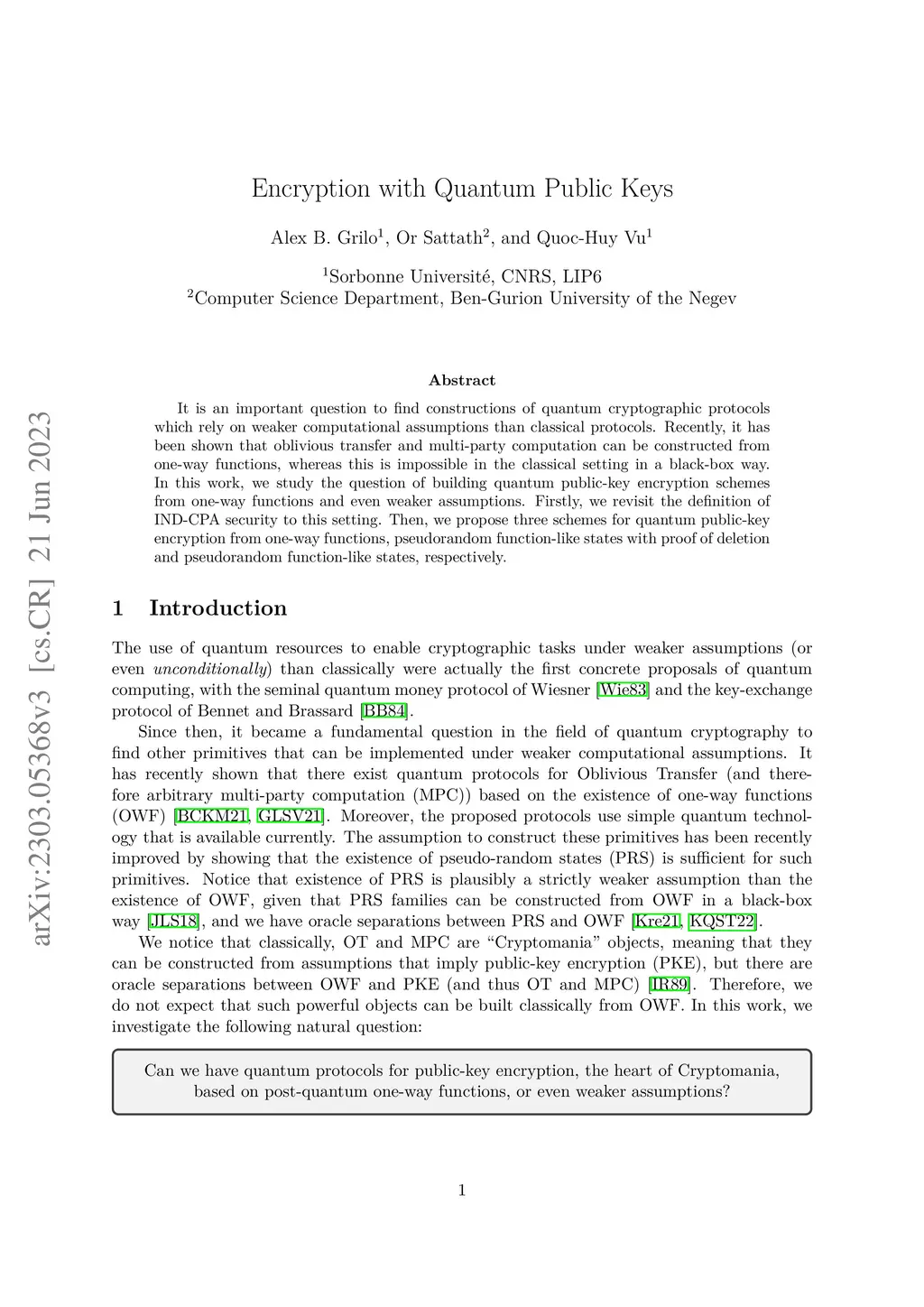 It is an important question to find constructions of quantum cryptographic protocols which rely on weaker computational assumptions than classical protocols. Recently, it has been shown that oblivious transfer and multi-party computation can be constructed from one-way functions, whereas this is impossible in the classical setting in a black-box way. In this work, we study the question of building quantum public-key encryption schemes from one-way functions and even weaker assumptions. Firstly, we revisit the definition of IND-CPA security to this setting. Then, we propose three schemes for quantum public-key encryption from one-way functions, pseudorandom function-like states with proof of deletion and pseudorandom function-like states, respectively.