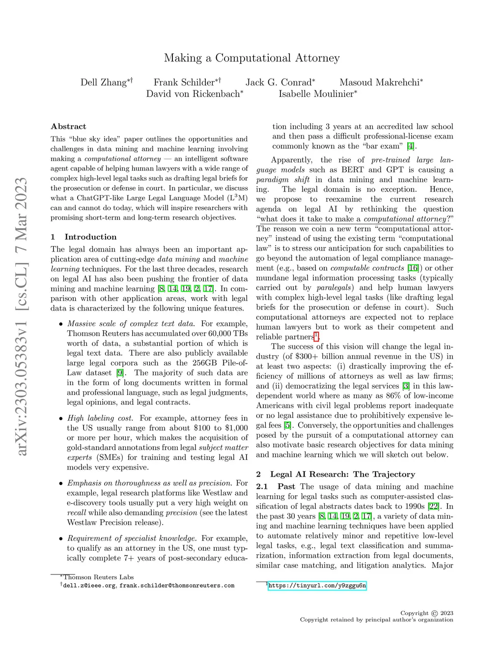 This "blue sky idea" paper outlines the opportunities and challenges in data mining and machine learning involving making a computational attorney -- an intelligent software agent capable of helping human lawyers with a wide range of complex high-level legal tasks such as drafting legal briefs for the prosecution or defense in court. In particular, we discuss what a ChatGPT-like Large Legal Language Model (LM) can and cannot do today, which will inspire researchers with promising short-term and long-term research objectives.