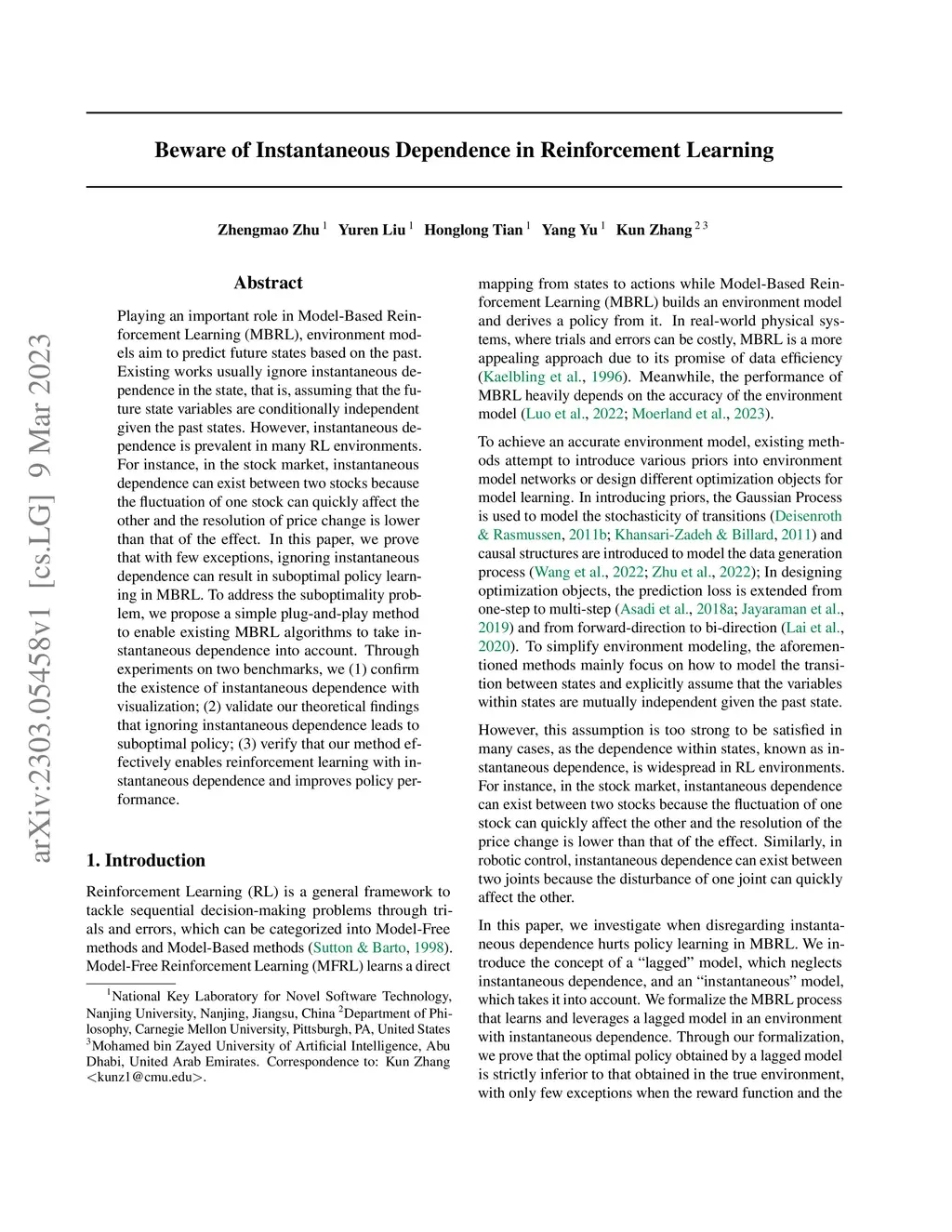 Playing an important role in Model-Based Reinforcement Learning (MBRL), environment models aim to predict future states based on the past. Existing works usually ignore instantaneous dependence in the state, that is, assuming that the future state variables are conditionally independent given the past states. However, instantaneous dependence is prevalent in many RL environments. For instance, in the stock market, instantaneous dependence can exist between two stocks because the fluctuation of one stock can quickly affect the other and the resolution of price change is lower than that of the effect. In this paper, we prove that with few exceptions, ignoring instantaneous dependence can result in suboptimal policy learning in MBRL. To address the suboptimality problem, we propose a simple plug-and-play method to enable existing MBRL algorithms to take instantaneous dependence into account. Through experiments on two benchmarks, we (1) confirm the existence of instantaneous dependence with visualization; (2) validate our theoretical findings that ignoring instantaneous dependence leads to suboptimal policy; (3) verify that our method effectively enables reinforcement learning with instantaneous dependence and improves policy performance.