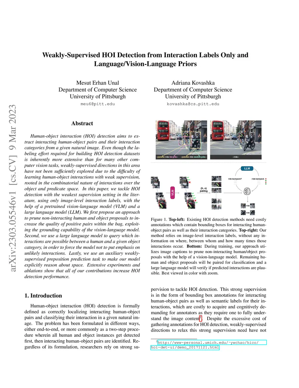 Human-object interaction (HOI) detection aims to extract interacting human-object pairs and their interaction categories from a given natural image. Even though the labeling effort required for building HOI detection datasets is inherently more extensive than for many other computer vision tasks, weakly-supervised directions in this area have not been sufficiently explored due to the difficulty of learning human-object interactions with weak supervision, rooted in the combinatorial nature of interactions over the object and predicate space. In this paper, we tackle HOI detection with the weakest supervision setting in the literature, using only image-level interaction labels, with the help of a pretrained vision-language model (VLM) and a large language model (LLM). We first propose an approach to prune non-interacting human and object proposals to increase the quality of positive pairs within the bag, exploiting the grounding capability of the vision-language model. Second, we use a large language model to query which interactions are possible between a human and a given object category, in order to force the model not to put emphasis on unlikely interactions. Lastly, we use an auxiliary weakly-supervised preposition prediction task to make our model explicitly reason about space. Extensive experiments and ablations show that all of our contributions increase HOI detection performance.