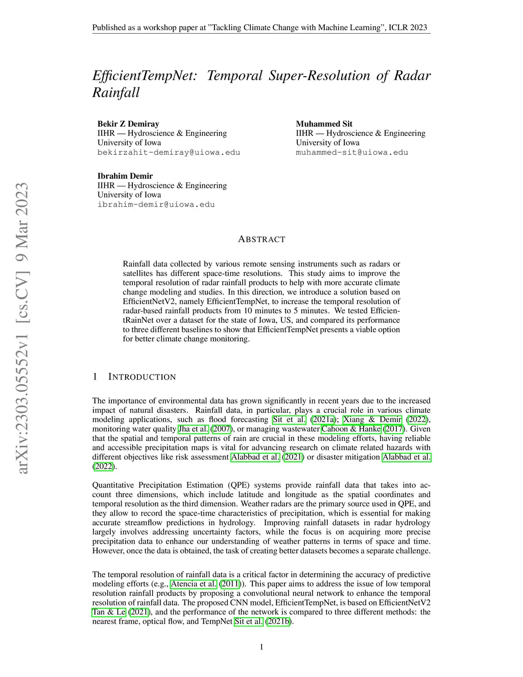 Rainfall data collected by various remote sensing instruments such as radars or satellites has different space-time resolutions. This study aims to improve the temporal resolution of radar rainfall products to help with more accurate climate change modeling and studies. In this direction, we introduce a solution based on EfficientNetV2, namely EfficientTempNet, to increase the temporal resolution of radar-based rainfall products from 10 minutes to 5 minutes. We tested EfficientRainNet over a dataset for the state of Iowa, US, and compared its performance to three different baselines to show that EfficientTempNet presents a viable option for better climate change monitoring.
