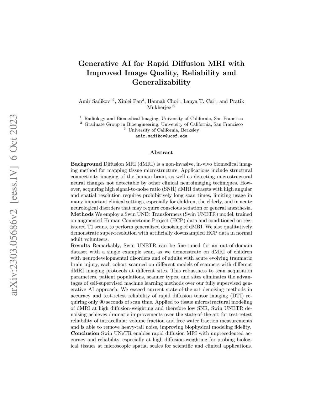 Diffusion MRI is a non-invasive, in-vivo biomedical imaging method for mapping tissue microstructure. Applications include structural connectivity imaging of the human brain and detecting microstructural neural changes. However, acquiring high signal-to-noise ratio dMRI datasets with high angular and spatial resolution requires prohibitively long scan times, limiting usage in many important clinical settings, especially for children, the elderly, and in acute neurological disorders that may require conscious sedation or general anesthesia. We employ a Swin UNEt Transformers model, trained on augmented Human Connectome Project data and conditioned on registered T1 scans, to perform generalized denoising of dMRI. We also qualitatively demonstrate super-resolution with artificially downsampled HCP data in normal adult volunteers. Remarkably, Swin UNETR can be fine-tuned for an out-of-domain dataset with a single example scan, as we demonstrate on dMRI of children with neurodevelopmental disorders and of adults with acute evolving traumatic brain injury, each cohort scanned on different models of scanners with different imaging protocols at different sites. We exceed current state-of-the-art denoising methods in accuracy and test-retest reliability of rapid diffusion tensor imaging requiring only 90 seconds of scan time. Applied to tissue microstructural modeling of dMRI, Swin UNETR denoising achieves dramatic improvements over the state-of-the-art for test-retest reliability of intracellular volume fraction and free water fraction measurements and can remove heavy-tail noise, improving biophysical modeling fidelity. Swin UNeTR enables rapid diffusion MRI with unprecedented accuracy and reliability, especially for probing biological tissues for scientific and clinical applications. The code and model are publicly available at https://github.com/ucsfncl/dmri-swin.