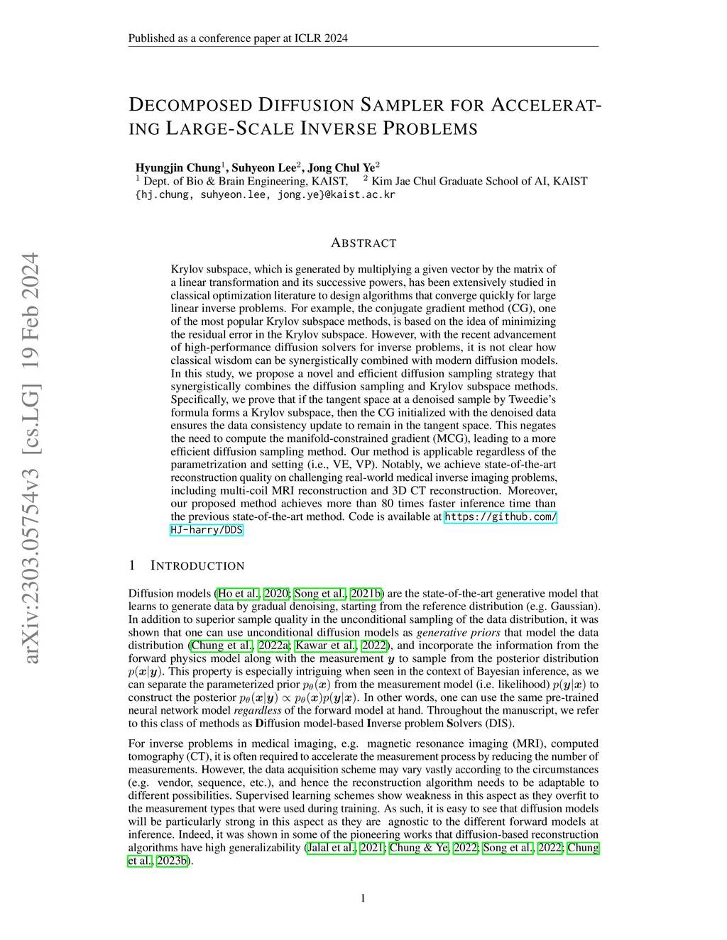 Krylov subspace, which is generated by multiplying a given vector by the matrix of a linear transformation and its successive powers, has been extensively studied in classical optimization literature to design algorithms that converge quickly for large linear inverse problems. For example, the conjugate gradient method (CG), one of the most popular Krylov subspace methods, is based on the idea of minimizing the residual error in the Krylov subspace. However, with the recent advancement of high-performance diffusion solvers for inverse problems, it is not clear how classical wisdom can be synergistically combined with modern diffusion models. In this study, we propose a novel and efficient diffusion sampling strategy that synergistically combines the diffusion sampling and Krylov subspace methods. Specifically, we prove that if the tangent space at a denoised sample by Tweedie's formula forms a Krylov subspace, then the CG initialized with the denoised data ensures the data consistency update to remain in the tangent space. This negates the need to compute the manifold-constrained gradient (MCG), leading to a more efficient diffusion sampling method. Our method is applicable regardless of the parametrization and setting (i.e., VE, VP). Notably, we achieve state-of-the-art reconstruction quality on challenging real-world medical inverse imaging problems, including multi-coil MRI reconstruction and 3D CT reconstruction. Moreover, our proposed method achieves more than 80 times faster inference time than the previous state-of-the-art method. Code is available at https://github.com/HJ-harry/DDS