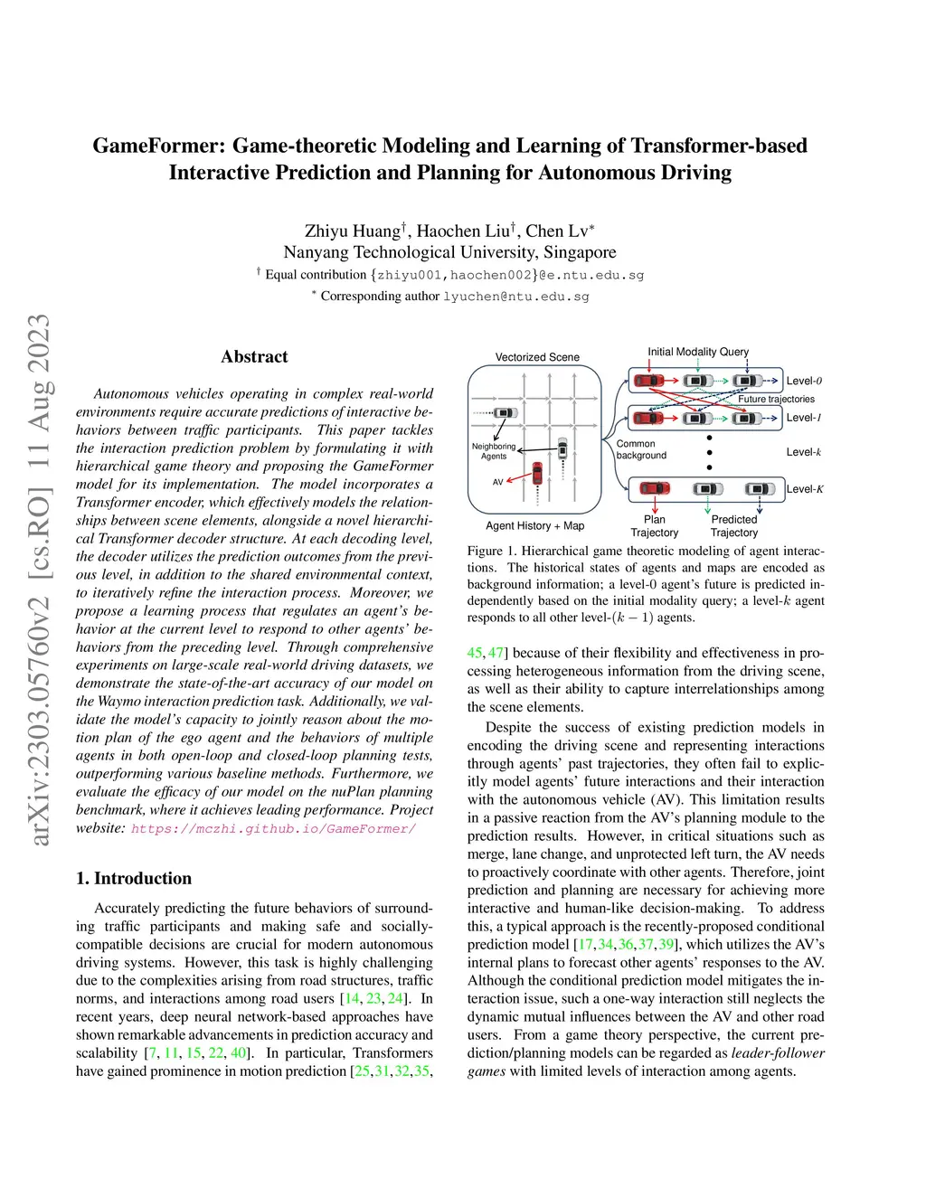 Autonomous vehicles operating in complex real-world environments require accurate predictions of interactive behaviors between traffic participants. This paper tackles the interaction prediction problem by formulating it with hierarchical game theory and proposing the GameFormer model for its implementation. The model incorporates a Transformer encoder, which effectively models the relationships between scene elements, alongside a novel hierarchical Transformer decoder structure. At each decoding level, the decoder utilizes the prediction outcomes from the previous level, in addition to the shared environmental context, to iteratively refine the interaction process. Moreover, we propose a learning process that regulates an agent's behavior at the current level to respond to other agents' behaviors from the preceding level. Through comprehensive experiments on large-scale real-world driving datasets, we demonstrate the state-of-the-art accuracy of our model on the Waymo interaction prediction task. Additionally, we validate the model's capacity to jointly reason about the motion plan of the ego agent and the behaviors of multiple agents in both open-loop and closed-loop planning tests, outperforming various baseline methods. Furthermore, we evaluate the efficacy of our model on the nuPlan planning benchmark, where it achieves leading performance.