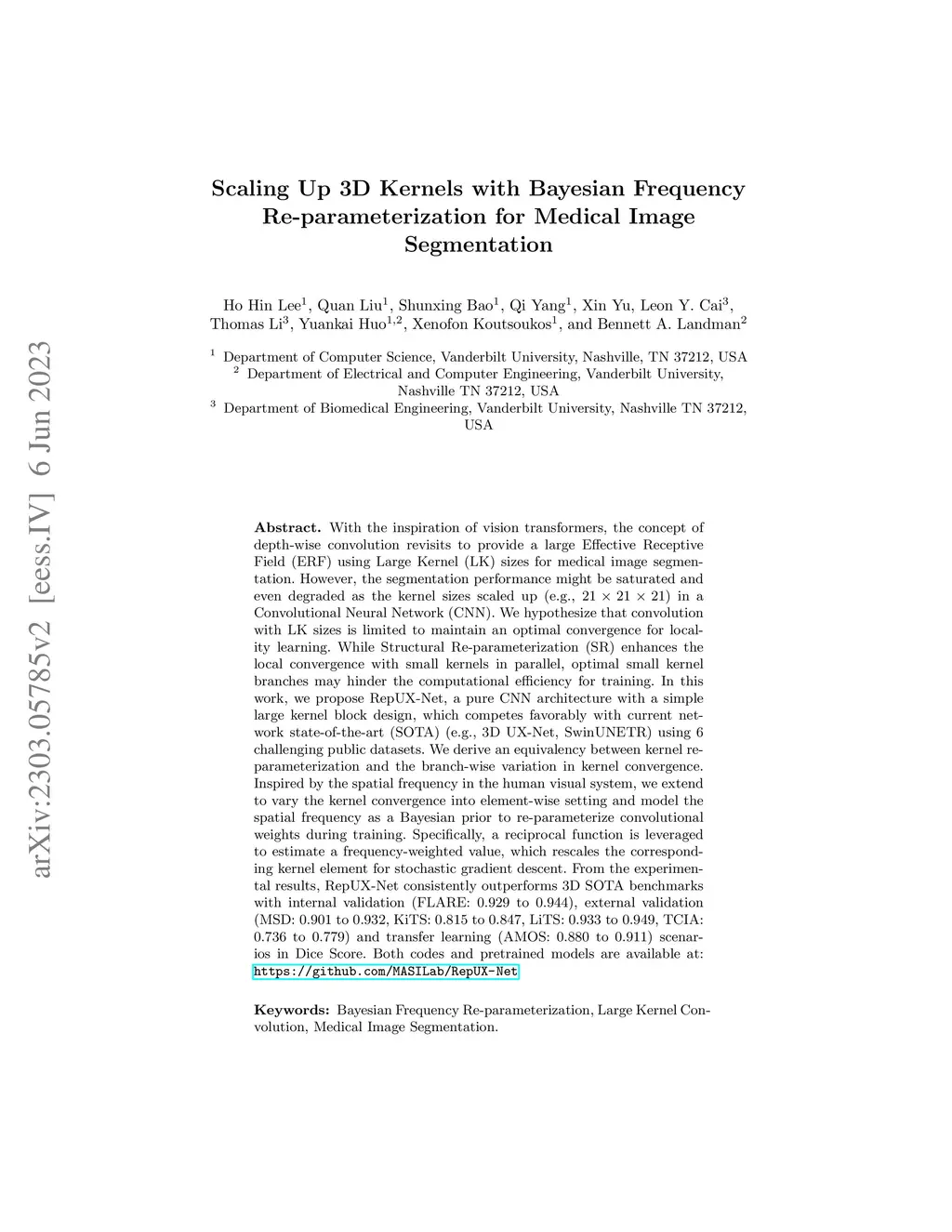 With the inspiration of vision transformers, the concept of depth-wise convolution revisits to provide a large Effective Receptive Field (ERF) using Large Kernel (LK) sizes for medical image segmentation. However, the segmentation performance might be saturated and even degraded as the kernel sizes scaled up (e.g., ) in a Convolutional Neural Network (CNN). We hypothesize that convolution with LK sizes is limited to maintain an optimal convergence for locality learning. While Structural Re-parameterization (SR) enhances the local convergence with small kernels in parallel, optimal small kernel branches may hinder the computational efficiency for training. In this work, we propose RepUX-Net, a pure CNN architecture with a simple large kernel block design, which competes favorably with current network state-of-the-art (SOTA) (e.g., 3D UX-Net, SwinUNETR) using 6 challenging public datasets. We derive an equivalency between kernel re-parameterization and the branch-wise variation in kernel convergence. Inspired by the spatial frequency in the human visual system, we extend to vary the kernel convergence into element-wise setting and model the spatial frequency as a Bayesian prior to re-parameterize convolutional weights during training. Specifically, a reciprocal function is leveraged to estimate a frequency-weighted value, which rescales the corresponding kernel element for stochastic gradient descent. From the experimental results, RepUX-Net consistently outperforms 3D SOTA benchmarks with internal validation (FLARE: 0.929 to 0.944), external validation (MSD: 0.901 to 0.932, KiTS: 0.815 to 0.847, LiTS: 0.933 to 0.949, TCIA: 0.736 to 0.779) and transfer learning (AMOS: 0.880 to 0.911) scenarios in Dice Score.