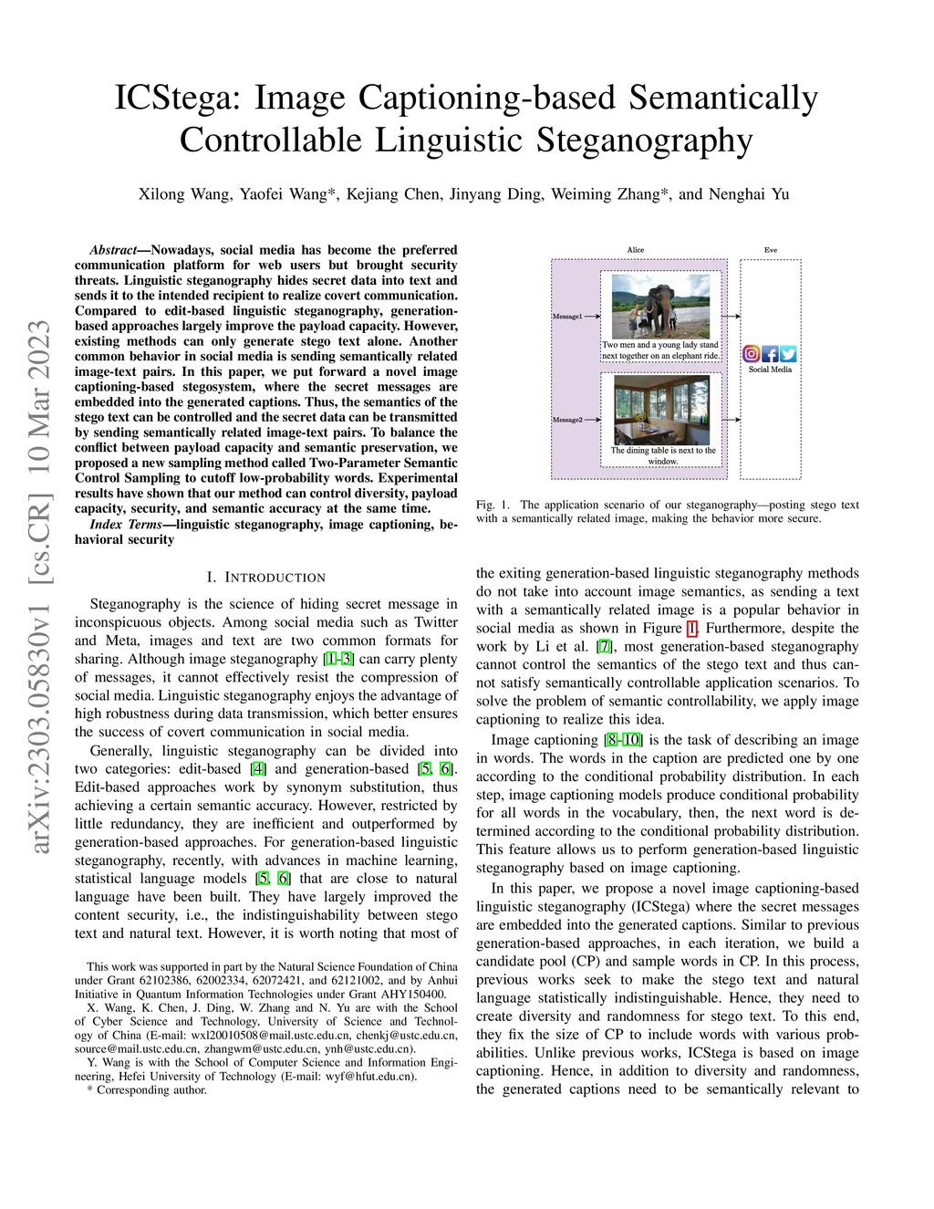 Nowadays, social media has become the preferred communication platform for web users but brought security threats. Linguistic steganography hides secret data into text and sends it to the intended recipient to realize covert communication. Compared to edit-based linguistic steganography, generation-based approaches largely improve the payload capacity. However, existing methods can only generate stego text alone. Another common behavior in social media is sending semantically related image-text pairs. In this paper, we put forward a novel image captioning-based stegosystem, where the secret messages are embedded into the generated captions. Thus, the semantics of the stego text can be controlled and the secret data can be transmitted by sending semantically related image-text pairs. To balance the conflict between payload capacity and semantic preservation, we proposed a new sampling method called Two-Parameter Semantic Control Sampling to cutoff low-probability words. Experimental results have shown that our method can control diversity, payload capacity, security, and semantic accuracy at the same time.