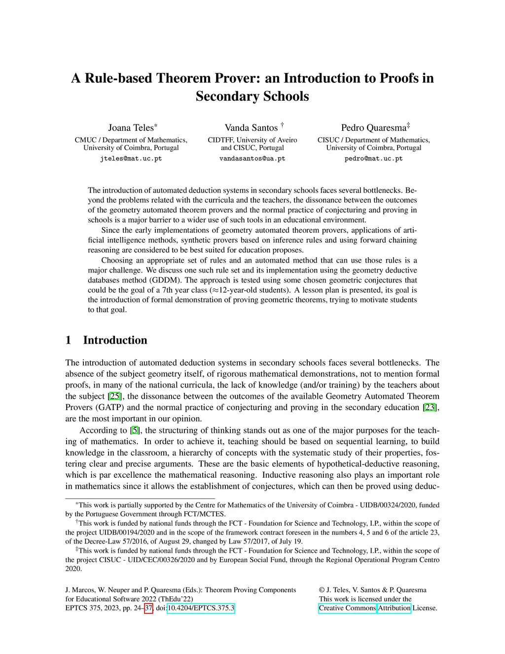 The introduction of automated deduction systems in secondary schools face several bottlenecks. Beyond the problems related with the curricula and the teachers, the dissonance between the outcomes of the geometry automated theorem provers and the normal practice of conjecturing and proving in schools is a major barrier to a wider use of such tools in an educational environment. Since the early implementations of geometry automated theorem provers, applications of artificial intelligence methods, synthetic provers based on inference rules and using forward chaining reasoning are considered to be more suited for education proposes. Choosing an appropriate set of rules and an automated method that can use those rules is a major challenge. We discuss one such rule set and its implementation using the geometry deductive databases method (GDDM). The approach is tested using some chosen geometric conjectures that could be the goal of a 7th year class (approx. 12-year-old students). A lesson plan is presented, its goal is the introduction of formal demonstration of proving geometric theorems, trying to motivate students to that goal