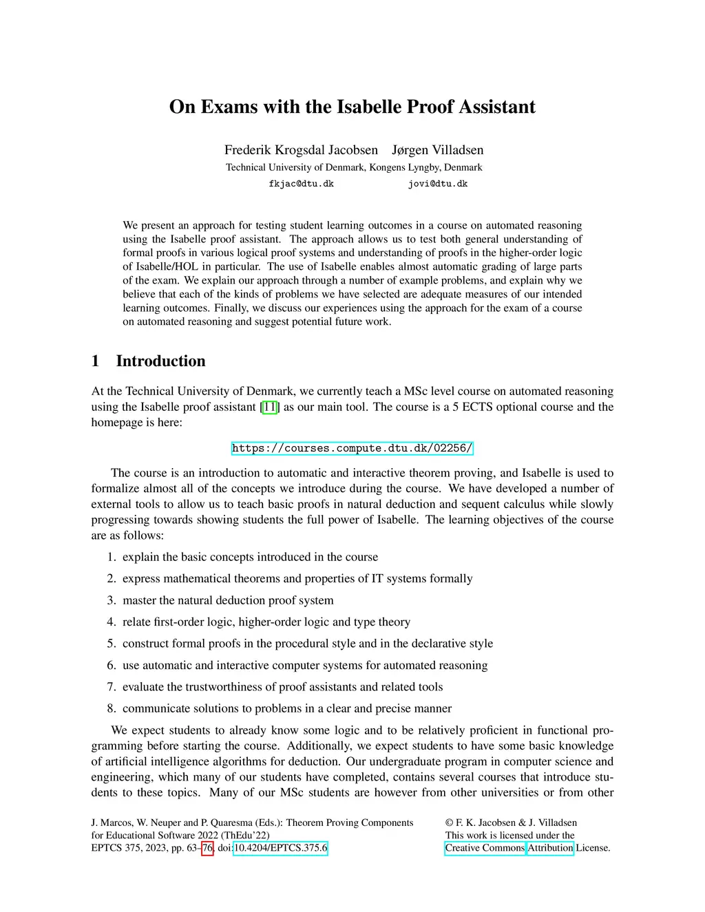 We present an approach for testing student learning outcomes in a course on automated reasoning using the Isabelle proof assistant. The approach allows us to test both general understanding of formal proofs in various logical proof systems and understanding of proofs in the higher-order logic of Isabelle/HOL in particular. The use of Isabelle enables almost automatic grading of large parts of the exam. We explain our approach through a number of example problems, and explain why we believe that each of the kinds of problems we have selected are adequate measures of our intended learning outcomes. Finally, we discuss our experiences using the approach for the exam of a course on automated reasoning and suggest potential future work.