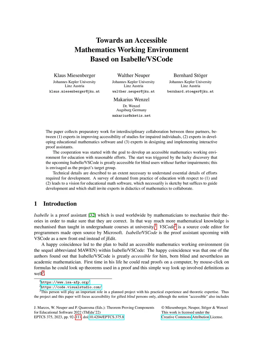 The paper collects preparatory work for interdisciplinary collaboration between three partners, between (1) expertise in improving accessibility of studies for impaired individuals, (2) expertise in developing educational mathematics software and (3) expertise in designing and implementing interactive proof assistants. The cooperation was started with the goal to develop an accessible mathematics working environment for education with reasonable efforts. The start was triggered by the lucky discovery that the upcoming Isabelle/VSCode is greatly accessible for blind users without further impairments; this is envisaged as the project's target group. Technical details are described to an extent necessary to understand essential details of efforts required for development. A survey of demand from practice of education with respect to (1) and (2) leads to a vision for educational math software, which necessarily is sketchy but suffices to guide development and which shall invite experts in didactics of mathematics to collaborate.