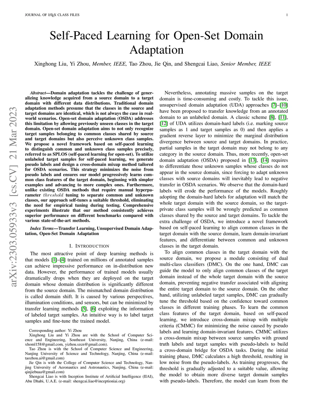 Domain adaptation tackles the challenge of generalizing knowledge acquired from a source domain to a target domain with different data distributions. Traditional domain adaptation methods presume that the classes in the source and target domains are identical, which is not always the case in real-world scenarios. Open-set domain adaptation (OSDA) addresses this limitation by allowing previously unseen classes in the target domain. Open-set domain adaptation aims to not only recognize target samples belonging to common classes shared by source and target domains but also perceive unknown class samples. We propose a novel framework based on self-paced learning to distinguish common and unknown class samples precisely, referred to as SPLOS (self-paced learning for open-set). To utilize unlabeled target samples for self-paced learning, we generate pseudo labels and design a cross-domain mixup method tailored for OSDA scenarios. This strategy minimizes the noise from pseudo labels and ensures our model progressively learns common class features of the target domain, beginning with simpler examples and advancing to more complex ones. Furthermore, unlike existing OSDA methods that require manual hyperparameter tuning to separate common and unknown classes, our approach self-tunes a suitable threshold, eliminating the need for empirical tuning during testing. Comprehensive experiments illustrate that our method consistently achieves superior performance on different benchmarks compared with various state-of-the-art methods.