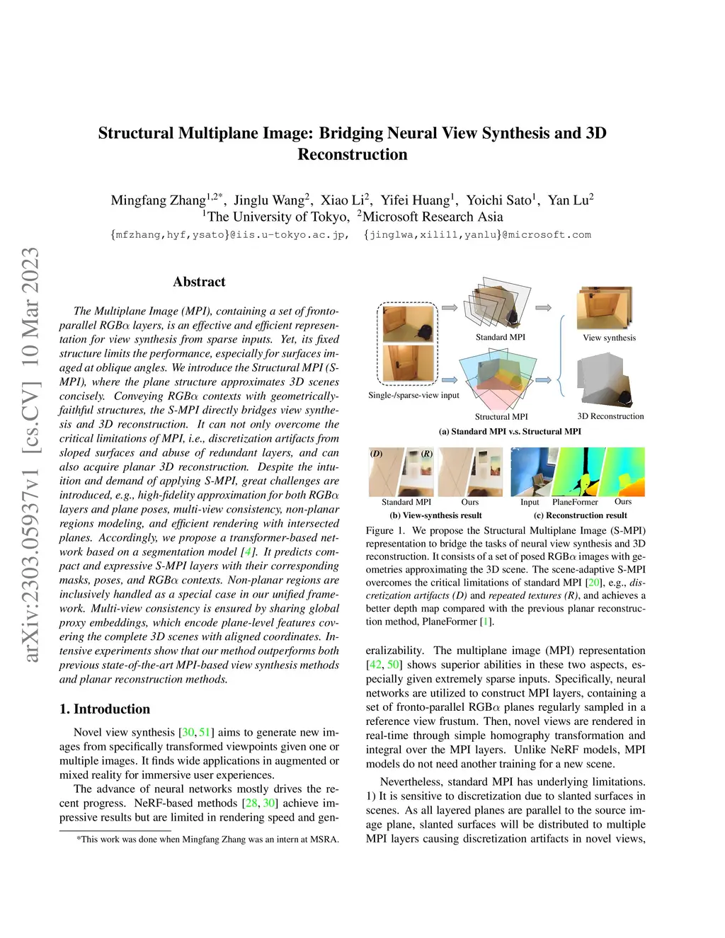 The Multiplane Image (MPI), containing a set of fronto-parallel RGBA layers, is an effective and efficient representation for view synthesis from sparse inputs. Yet, its fixed structure limits the performance, especially for surfaces imaged at oblique angles. We introduce the Structural MPI (S-MPI), where the plane structure approximates 3D scenes concisely. Conveying RGBA contexts with geometrically-faithful structures, the S-MPI directly bridges view synthesis and 3D reconstruction. It can not only overcome the critical limitations of MPI, i.e., discretization artifacts from sloped surfaces and abuse of redundant layers, and can also acquire planar 3D reconstruction. Despite the intuition and demand of applying S-MPI, great challenges are introduced, e.g., high-fidelity approximation for both RGBA layers and plane poses, multi-view consistency, non-planar regions modeling, and efficient rendering with intersected planes. Accordingly, we propose a transformer-based network based on a segmentation model. It predicts compact and expressive S-MPI layers with their corresponding masks, poses, and RGBA contexts. Non-planar regions are inclusively handled as a special case in our unified framework. Multi-view consistency is ensured by sharing global proxy embeddings, which encode plane-level features covering the complete 3D scenes with aligned coordinates. Intensive experiments show that our method outperforms both previous state-of-the-art MPI-based view synthesis methods and planar reconstruction methods.
