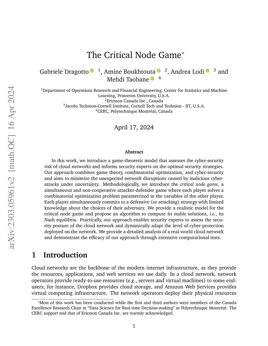 In this work, we introduce a game-theoretic model that assesses the cyber-security risk of cloud networks and informs security experts on the optimal security strategies. Our approach combines game theory, combinatorial optimization, and cyber-security and aims to minimize the unexpected network disruptions caused by malicious cyber-attacks under uncertainty. Methodologically, we introduce the critical node game, a simultaneous and non-cooperative attacker-defender game where each player solves a combinatorial optimization problem parametrized in the variables of the other player. Each player simultaneously commits to a defensive (or attacking) strategy with limited knowledge about the choices of their adversary. We provide a realistic model for the critical node game and propose an algorithm to compute its stable solutions, i.e., its Nash equilibria. Practically, our approach enables security experts to assess the security posture of the cloud network and dynamically adapt the level of cyber-protection deployed on the network. We provide a detailed analysis of a real-world cloud network and demonstrate the efficacy of our approach through extensive computational tests.