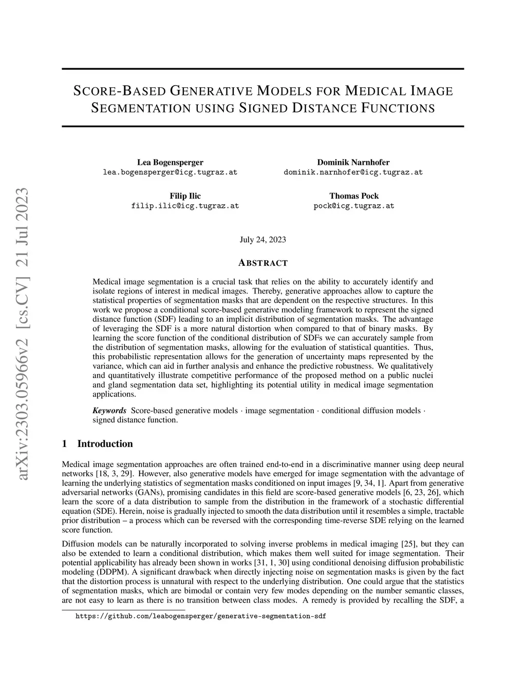 Medical image segmentation is a crucial task that relies on the ability to accurately identify and isolate regions of interest in medical images. Thereby, generative approaches allow to capture the statistical properties of segmentation masks that are dependent on the respective structures. In this work we propose a conditional score-based generative modeling framework to represent the signed distance function (SDF) leading to an implicit distribution of segmentation masks. The advantage of leveraging the SDF is a more natural distortion when compared to that of binary masks. By learning the score function of the conditional distribution of SDFs we can accurately sample from the distribution of segmentation masks, allowing for the evaluation of statistical quantities. Thus, this probabilistic representation allows for the generation of uncertainty maps represented by the variance, which can aid in further analysis and enhance the predictive robustness. We qualitatively and quantitatively illustrate competitive performance of the proposed method on a public nuclei and gland segmentation data set, highlighting its potential utility in medical image segmentation applications.