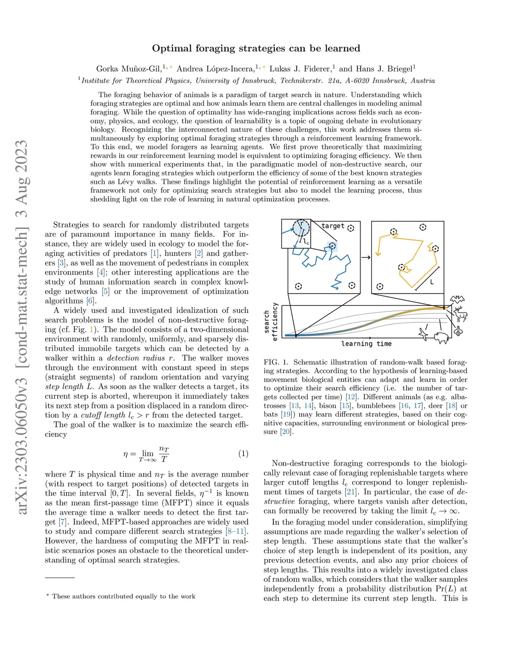 L\'evy walks and other theoretical models of optimal foraging have been successfully used to describe real-world scenarios, attracting attention in several fields such as economy, physics, ecology, and evolutionary biology. However, it remains unclear in most cases which strategies maximize foraging efficiency and whether such strategies can be learned by living organisms. To address these questions, we model foragers as reinforcement learning agents. We first prove theoretically that maximizing rewards in our reinforcement learning model is equivalent to optimizing foraging efficiency. We then show with numerical experiments that our agents learn foraging strategies which outperform the efficiency of known strategies such as L\'evy walks.