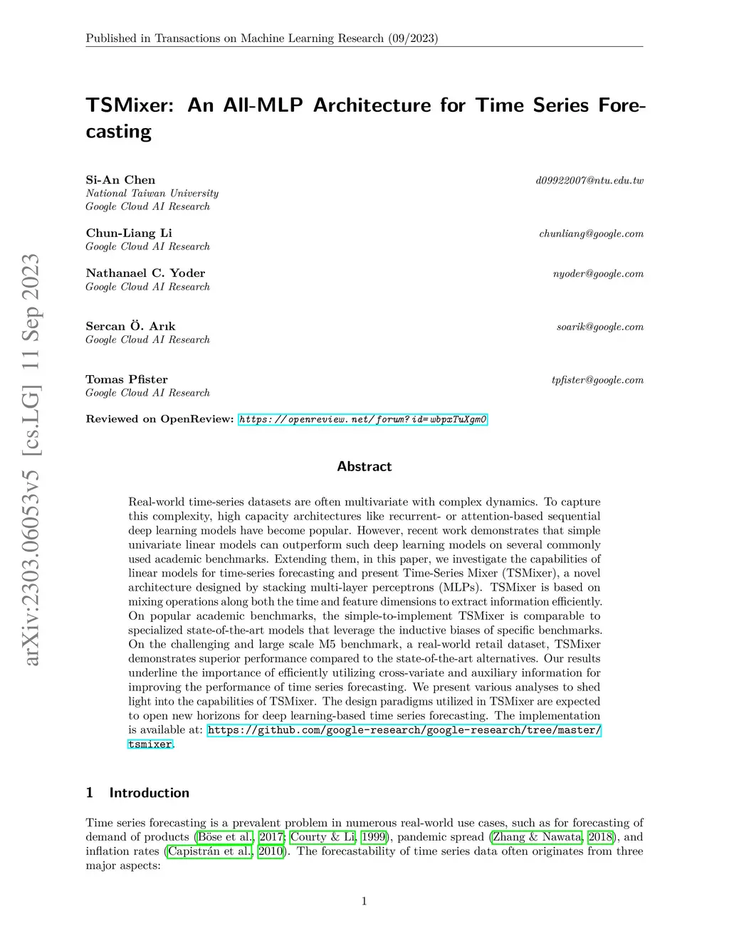 Real-world time-series datasets are often multivariate with complex dynamics. To capture this complexity, high capacity architectures like recurrent- or attention-based sequential deep learning models have become popular. However, recent work demonstrates that simple univariate linear models can outperform such deep learning models on several commonly used academic benchmarks. Extending them, in this paper, we investigate the capabilities of linear models for time-series forecasting and present Time-Series Mixer (TSMixer), a novel architecture designed by stacking multi-layer perceptrons (MLPs). TSMixer is based on mixing operations along both the time and feature dimensions to extract information efficiently. On popular academic benchmarks, the simple-to-implement TSMixer is comparable to specialized state-of-the-art models that leverage the inductive biases of specific benchmarks. On the challenging and large scale M5 benchmark, a real-world retail dataset, TSMixer demonstrates superior performance compared to the state-of-the-art alternatives. Our results underline the importance of efficiently utilizing cross-variate and auxiliary information for improving the performance of time series forecasting. We present various analyses to shed light into the capabilities of TSMixer. The design paradigms utilized in TSMixer are expected to open new horizons for deep learning-based time series forecasting. The implementation is available at https://github.com/google-research/google-research/tree/master/tsmixer