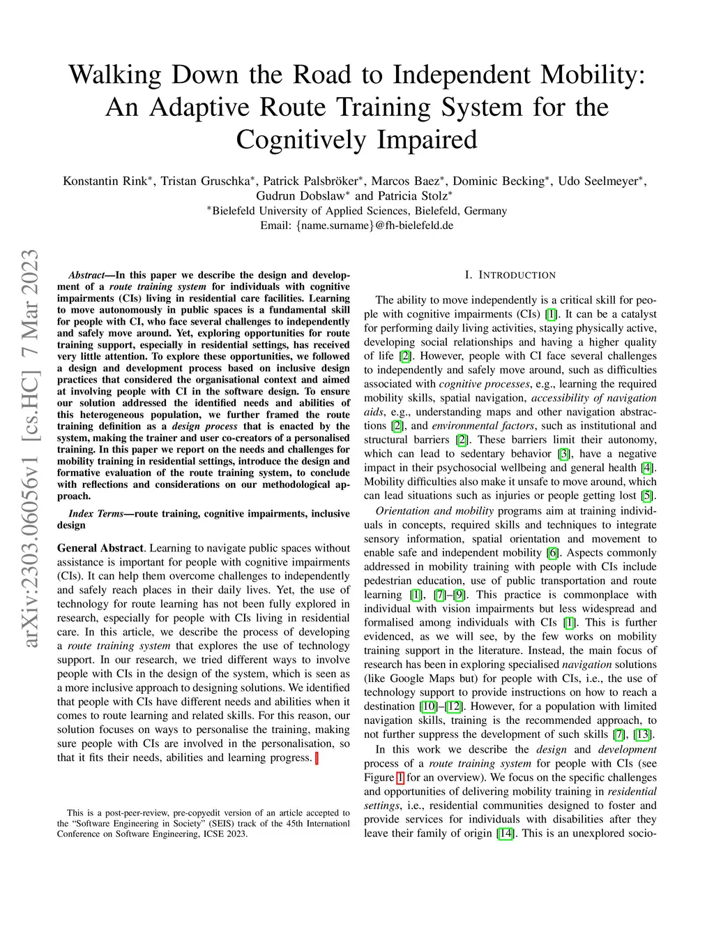 In this paper we describe the design and development of a route training system for individuals with cognitive impairments (CIs) living in residential care facilities. Learning to move autonomously in public spaces is a fundamental skill for people with CI, who face several challenges to independently and safely move around. Yet, exploring opportunities for route training support, especially in residential settings, has received very little attention. To explore these opportunities, we followed a design and development process based on inclusive design practices that considered the organisational context and aimed at involving people with CI in the software design. To ensure our solution addressed the identified needs and abilities of this heterogeneous population, we further framed the route training definition as a design process that is enacted by the system, making the trainer and user co-creators of a personalised training. In this paper we report on the needs and challenges for mobility training in residential settings, introduce the design and formative evaluation of the route training system, to conclude with reflections and considerations on our methodological approach.