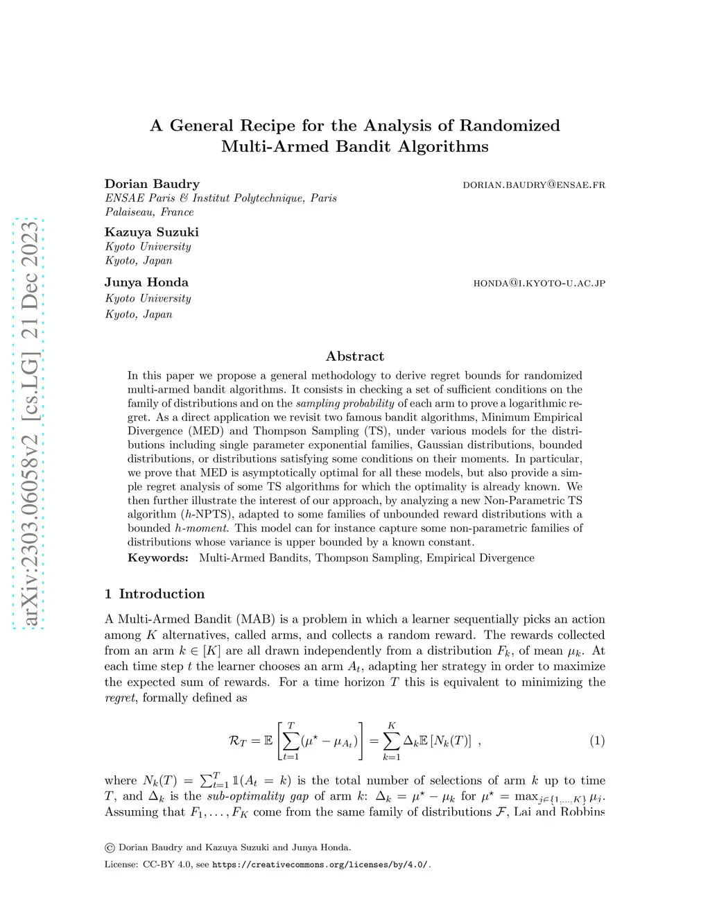 In this paper we propose a general methodology to derive regret bounds for randomized multi-armed bandit algorithms. It consists in checking a set of sufficient conditions on the sampling probability of each arm and on the family of distributions to prove a logarithmic regret. As a direct application we revisit two famous bandit algorithms, Minimum Empirical Divergence (MED) and Thompson Sampling (TS), under various models for the distributions including single parameter exponential families, Gaussian distributions, bounded distributions, or distributions satisfying some conditions on their moments. In particular, we prove that MED is asymptotically optimal for all these models, but also provide a simple regret analysis of some TS algorithms for which the optimality is already known. We then further illustrate the interest of our approach, by analyzing a new Non-Parametric TS algorithm (h-NPTS), adapted to some families of unbounded reward distributions with a bounded h-moment. This model can for instance capture some non-parametric families of distributions whose variance is upper bounded by a known constant.
