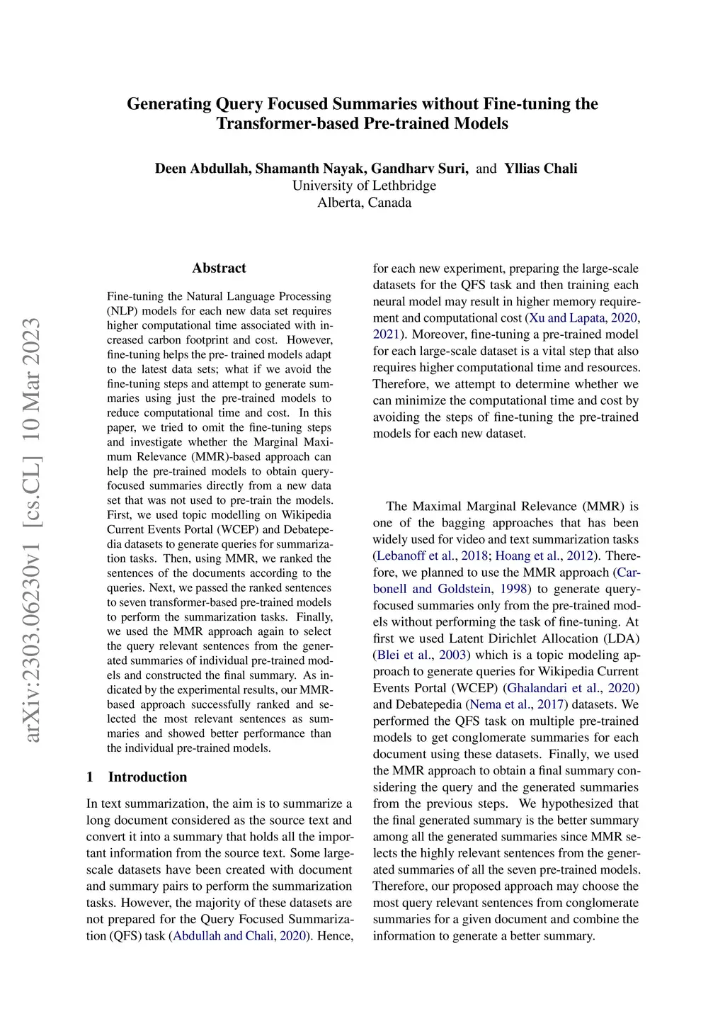 Fine-tuning the Natural Language Processing (NLP) models for each new data set requires higher computational time associated with increased carbon footprint and cost. However, fine-tuning helps the pre-trained models adapt to the latest data sets; what if we avoid the fine-tuning steps and attempt to generate summaries using just the pre-trained models to reduce computational time and cost. In this paper, we tried to omit the fine-tuning steps and investigate whether the Marginal Maximum Relevance (MMR)-based approach can help the pre-trained models to obtain query-focused summaries directly from a new data set that was not used to pre-train the models. First, we used topic modelling on Wikipedia Current Events Portal (WCEP) and Debatepedia datasets to generate queries for summarization tasks. Then, using MMR, we ranked the sentences of the documents according to the queries. Next, we passed the ranked sentences to seven transformer-based pre-trained models to perform the summarization tasks. Finally, we used the MMR approach again to select the query relevant sentences from the generated summaries of individual pre-trained models and constructed the final summary. As indicated by the experimental results, our MMR-based approach successfully ranked and selected the most relevant sentences as summaries and showed better performance than the individual pre-trained models.