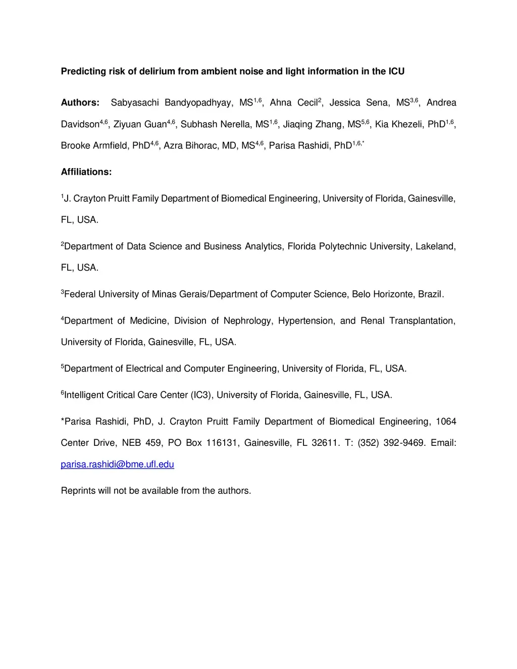 Predicting risk of delirium from ambient noise and light information in