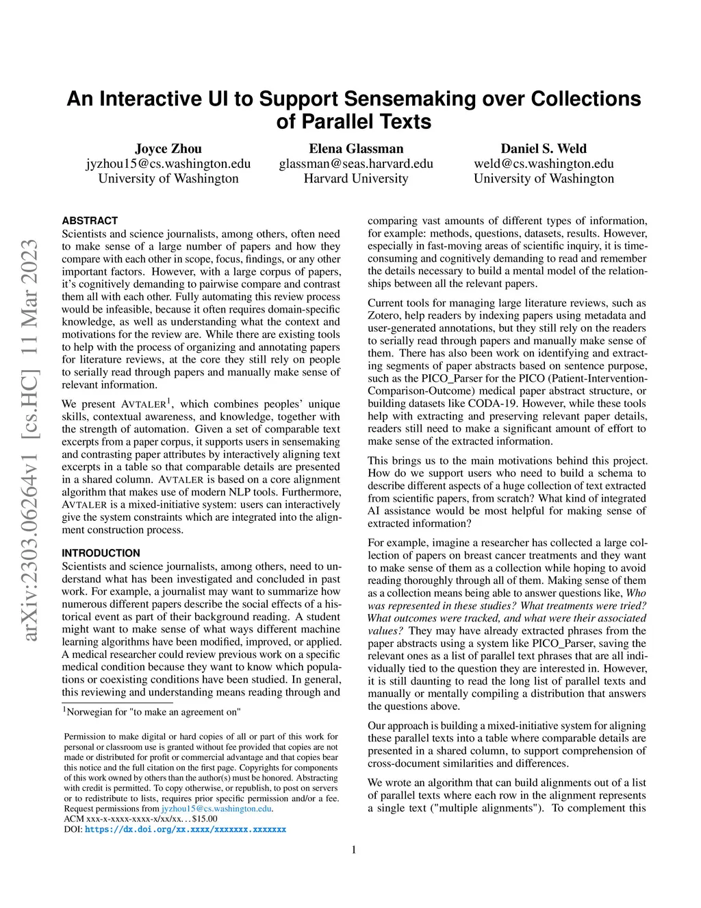 Scientists and science journalists, among others, often need to make sense of a large number of papers and how they compare with each other in scope, focus, findings, or any other important factors. However, with a large corpus of papers, it's cognitively demanding to pairwise compare and contrast them all with each other. Fully automating this review process would be infeasible, because it often requires domain-specific knowledge, as well as understanding what the context and motivations for the review are. While there are existing tools to help with the process of organizing and annotating papers for literature reviews, at the core they still rely on people to serially read through papers and manually make sense of relevant information. We present AVTALER, which combines peoples' unique skills, contextual awareness, and knowledge, together with the strength of automation. Given a set of comparable text excerpts from a paper corpus, it supports users in sensemaking and contrasting paper attributes by interactively aligning text excerpts in a table so that comparable details are presented in a shared column. AVTALER is based on a core alignment algorithm that makes use of modern NLP tools. Furthermore, AVTALER is a mixed-initiative system: users can interactively give the system constraints which are integrated into the alignment construction process.
