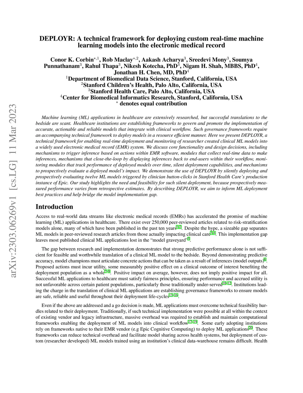 Machine learning (ML) applications in healthcare are extensively researched, but successful translations to the bedside are scant. Healthcare institutions are establishing frameworks to govern and promote the implementation of accurate, actionable and reliable models that integrate with clinical workflow. Such governance frameworks require an accompanying technical framework to deploy models in a resource efficient manner. Here we present DEPLOYR, a technical framework for enabling real-time deployment and monitoring of researcher created clinical ML models into a widely used electronic medical record (EMR) system. We discuss core functionality and design decisions, including mechanisms to trigger inference based on actions within EMR software, modules that collect real-time data to make inferences, mechanisms that close-the-loop by displaying inferences back to end-users within their workflow, monitoring modules that track performance of deployed models over time, silent deployment capabilities, and mechanisms to prospectively evaluate a deployed model's impact. We demonstrate the use of DEPLOYR by silently deploying and prospectively evaluating twelve ML models triggered by clinician button-clicks in Stanford Health Care's production instance of Epic. Our study highlights the need and feasibility for such silent deployment, because prospectively measured performance varies from retrospective estimates. By describing DEPLOYR, we aim to inform ML deployment best practices and help bridge the model implementation gap.