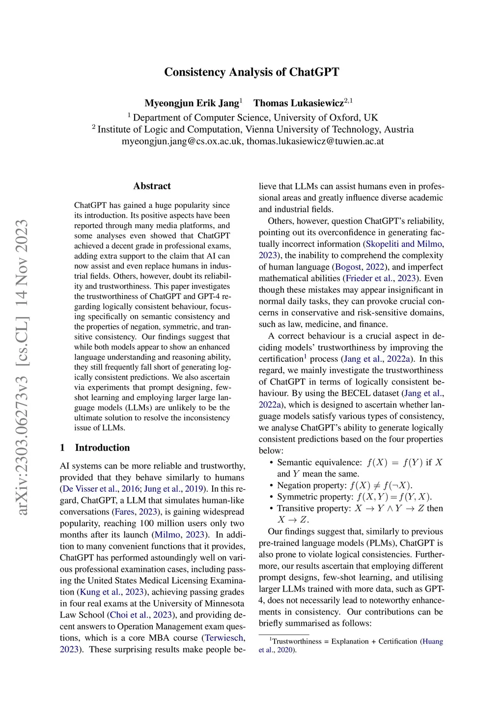 ChatGPT has gained a huge popularity since its introduction. Its positive aspects have been reported through many media platforms, and some analyses even showed that ChatGPT achieved a decent grade in professional exams, adding extra support to the claim that AI can now assist and even replace humans in industrial fields. Others, however, doubt its reliability and trustworthiness. This paper investigates the trustworthiness of ChatGPT and GPT-4 regarding logically consistent behaviour, focusing specifically on semantic consistency and the properties of negation, symmetric, and transitive consistency. Our findings suggest that while both models appear to show an enhanced language understanding and reasoning ability, they still frequently fall short of generating logically consistent predictions. We also ascertain via experiments that prompt designing, few-shot learning and employing larger large language models (LLMs) are unlikely to be the ultimate solution to resolve the inconsistency issue of LLMs.