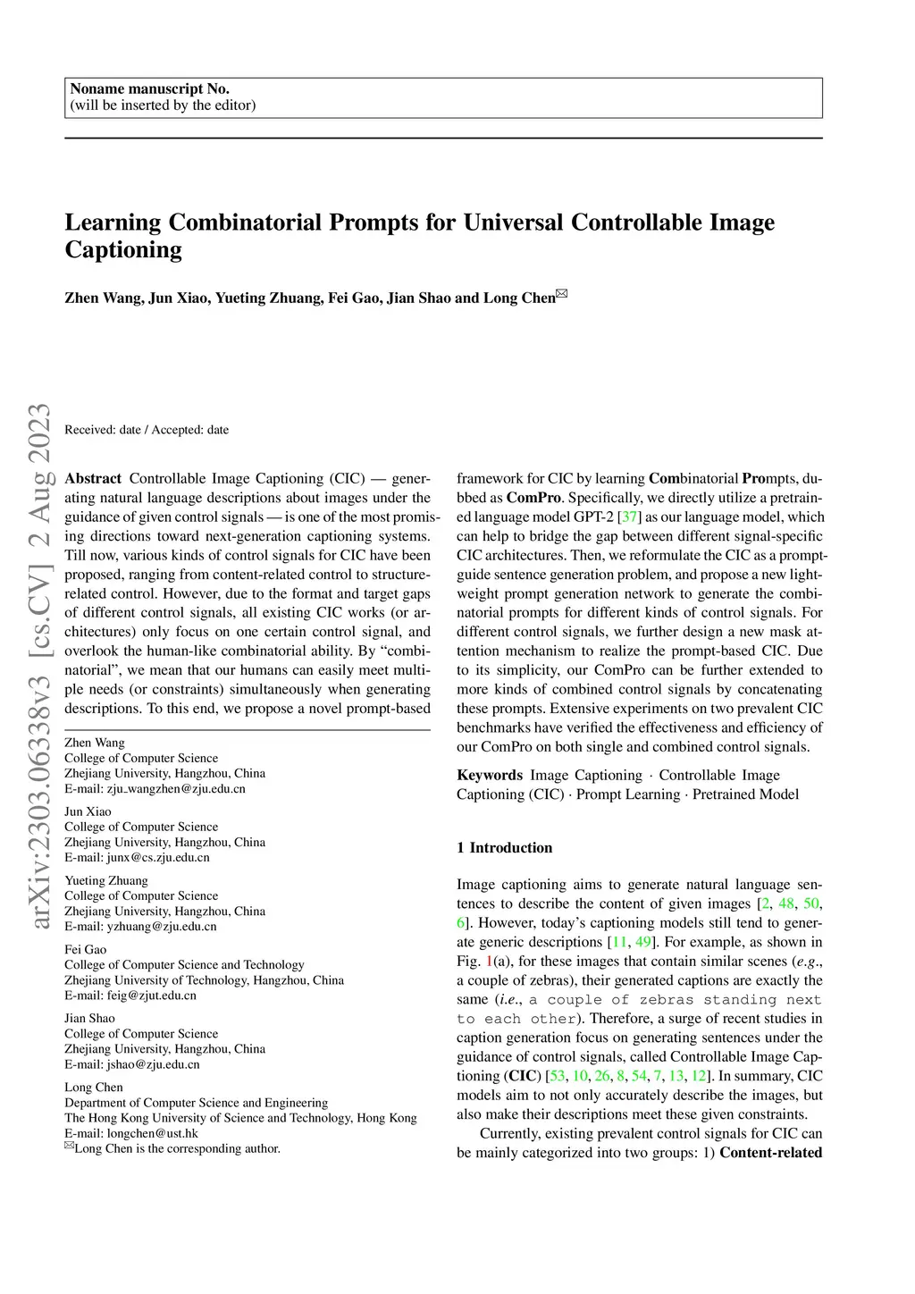 Controllable Image Captioning (CIC) -- generating natural language descriptions about images under the guidance of given control signals -- is one of the most promising directions towards next-generation captioning systems. Till now, various kinds of control signals for CIC have been proposed, ranging from content-related control to structure-related control. However, due to the format and target gaps of different control signals, all existing CIC works (or architectures) only focus on one certain control signal, and overlook the human-like combinatorial ability. By ``combinatorial", we mean that our humans can easily meet multiple needs (or constraints) simultaneously when generating descriptions. To this end, we propose a novel prompt-based framework for CIC by learning Combinatorial Prompts, dubbed as ComPro. Specifically, we directly utilize a pretrained language model GPT-2 as our language model, which can help to bridge the gap between different signal-specific CIC architectures. Then, we reformulate the CIC as a prompt-guide sentence generation problem, and propose a new lightweight prompt generation network to generate the combinatorial prompts for different kinds of control signals. For different control signals, we further design a new mask attention mechanism to realize the prompt-based CIC. Due to its simplicity, our ComPro can be further extended to more kinds of combined control signals by concatenating these prompts. Extensive experiments on two prevalent CIC benchmarks have verified the effectiveness and efficiency of our ComPro on both single and combined control signals.