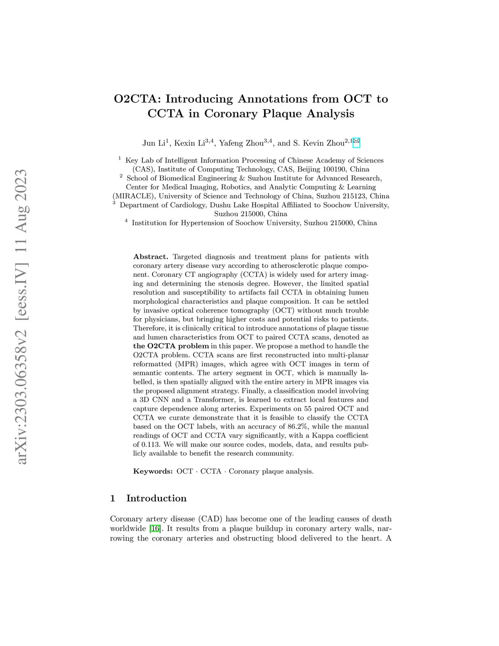 Targeted diagnosis and treatment plans for patients with coronary artery disease vary according to atherosclerotic plaque component. Coronary CT angiography (CCTA) is widely used for artery imaging and determining the stenosis degree. However, the limited spatial resolution and susceptibility to artifacts fail CCTA in obtaining lumen morphological characteristics and plaque composition. It can be settled by invasive optical coherence tomography (OCT) without much trouble for physicians, but bringing higher costs and potential risks to patients. Therefore, it is clinically critical to introduce annotations of plaque tissue and lumen characteristics from OCT to paired CCTA scans, denoted as \textbf{the O2CTA problem} in this paper. We propose a method to handle the O2CTA problem. CCTA scans are first reconstructed into multi-planar reformatted (MPR) images, which agree with OCT images in term of semantic contents. The artery segment in OCT, which is manually labelled, is then spatially aligned with the entire artery in MPR images via the proposed alignment strategy. Finally, a classification model involving a 3D CNN and a Transformer, is learned to extract local features and capture dependence along arteries. Experiments on 55 paired OCT and CCTA we curate demonstrate that it is feasible to classify the CCTA based on the OCT labels, with an accuracy of 86.2%, while the manual readings of OCT and CCTA vary significantly, with a Kappa coefficient of 0.113. We will make our source codes, models, data, and results publicly available to benefit the research community.