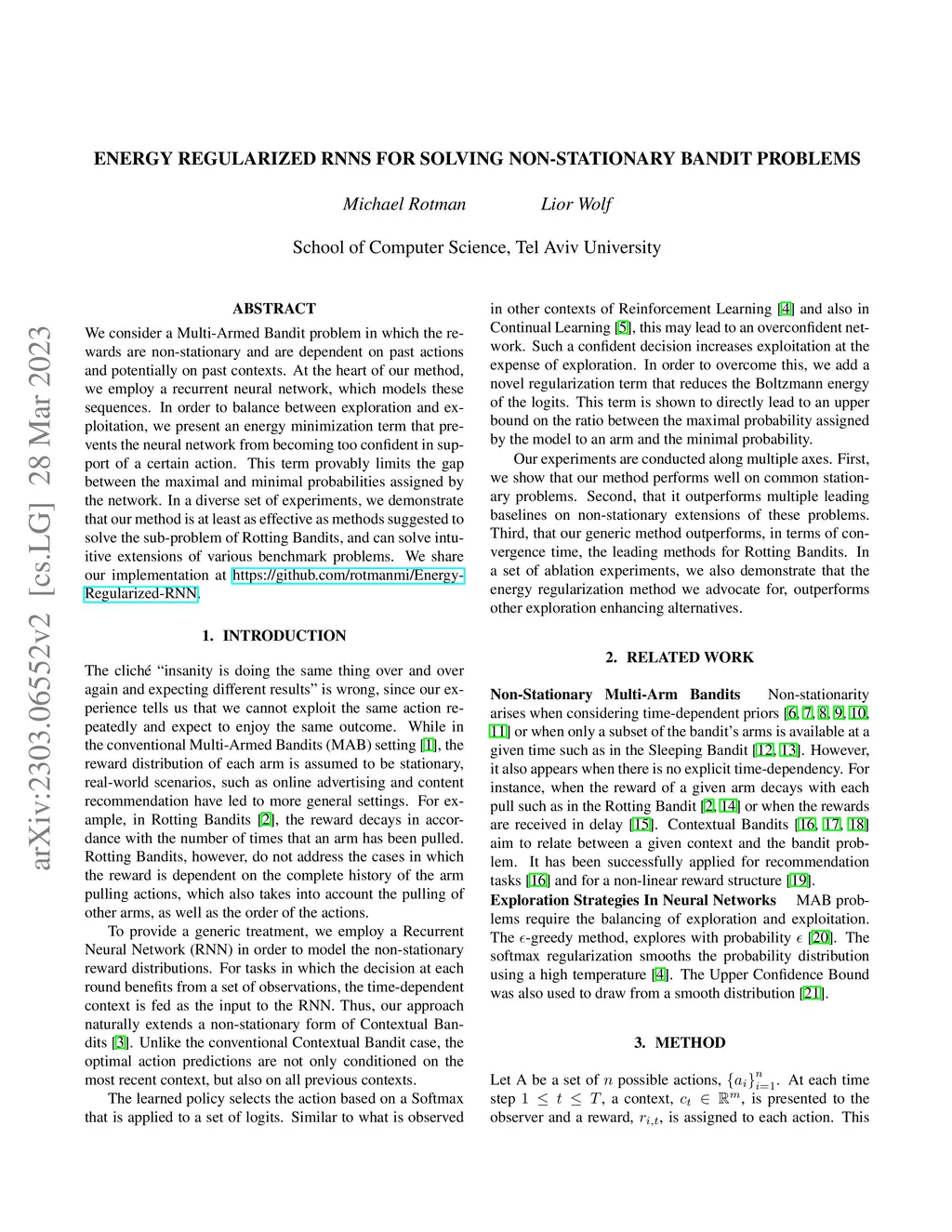 We consider a Multi-Armed Bandit problem in which the rewards are non-stationary and are dependent on past actions and potentially on past contexts. At the heart of our method, we employ a recurrent neural network, which models these sequences. In order to balance between exploration and exploitation, we present an energy minimization term that prevents the neural network from becoming too confident in support of a certain action. This term provably limits the gap between the maximal and minimal probabilities assigned by the network. In a diverse set of experiments, we demonstrate that our method is at least as effective as methods suggested to solve the sub-problem of Rotting Bandits, and can solve intuitive extensions of various benchmark problems. We share our implementation at https://github.com/rotmanmi/Energy-Regularized-RNN.