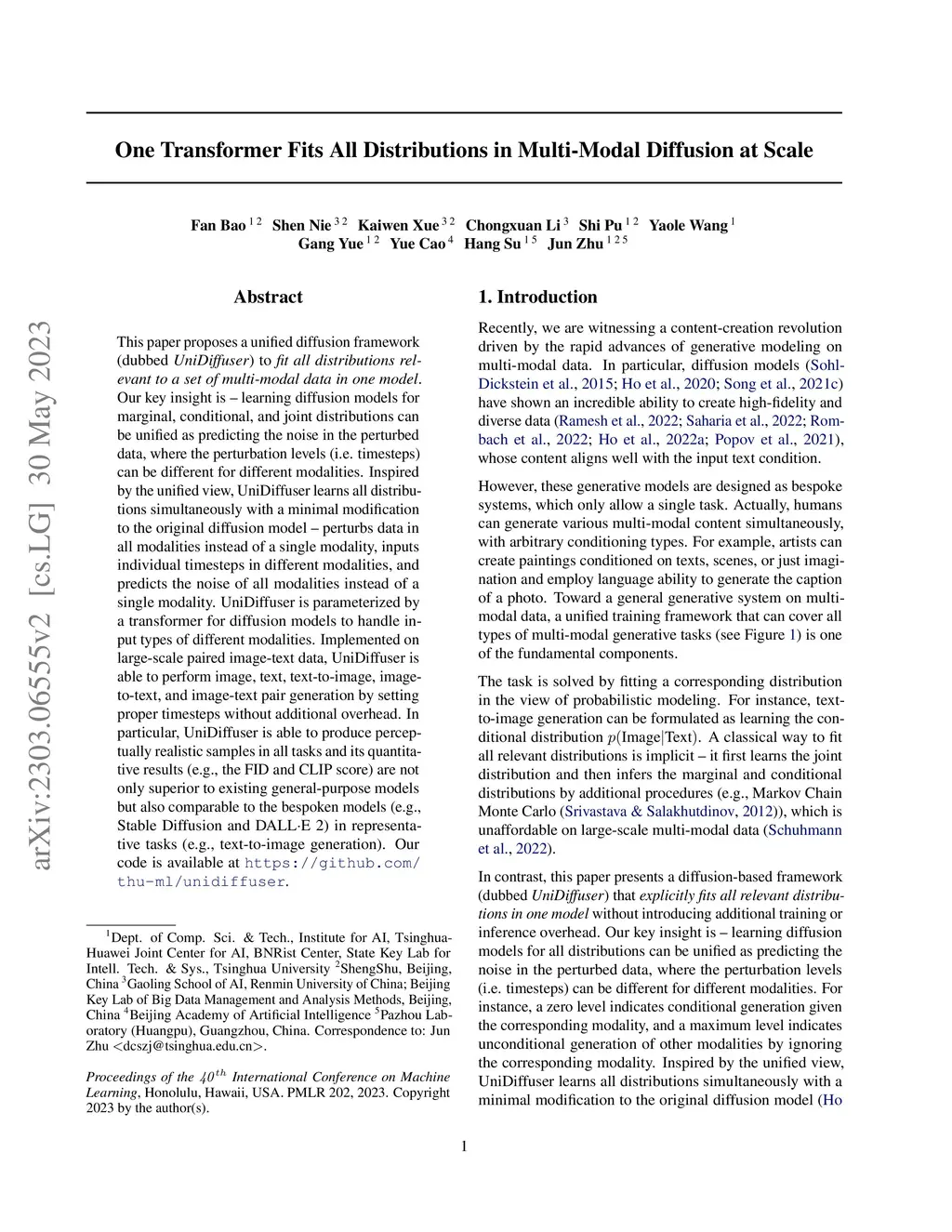 This paper proposes a unified diffusion framework (dubbed UniDiffuser) to fit all distributions relevant to a set of multi-modal data in one model. Our key insight is -- learning diffusion models for marginal, conditional, and joint distributions can be unified as predicting the noise in the perturbed data, where the perturbation levels (i.e. timesteps) can be different for different modalities. Inspired by the unified view, UniDiffuser learns all distributions simultaneously with a minimal modification to the original diffusion model -- perturbs data in all modalities instead of a single modality, inputs individual timesteps in different modalities, and predicts the noise of all modalities instead of a single modality. UniDiffuser is parameterized by a transformer for diffusion models to handle input types of different modalities. Implemented on large-scale paired image-text data, UniDiffuser is able to perform image, text, text-to-image, image-to-text, and image-text pair generation by setting proper timesteps without additional overhead. In particular, UniDiffuser is able to produce perceptually realistic samples in all tasks and its quantitative results (e.g., the FID and CLIP score) are not only superior to existing general-purpose models but also comparable to the bespoken models (e.g., Stable Diffusion and DALL-E 2) in representative tasks (e.g., text-to-image generation).
