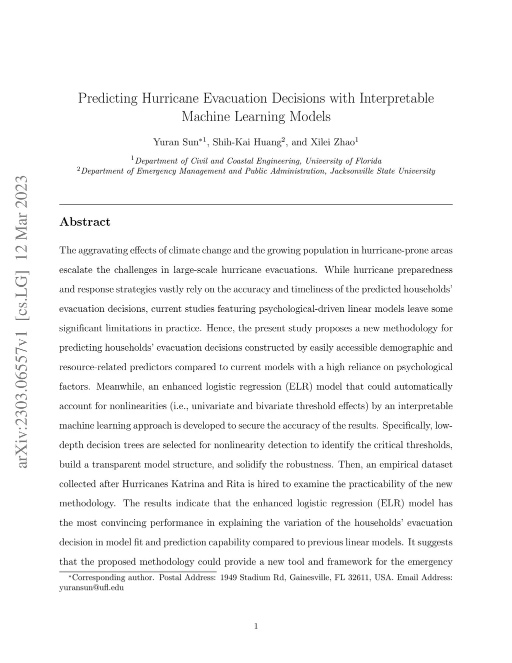 The aggravating effects of climate change and the growing population in hurricane-prone areas escalate the challenges in large-scale hurricane evacuations. While hurricane preparedness and response strategies vastly rely on the accuracy and timeliness of the predicted households' evacuation decisions, current studies featuring psychological-driven linear models leave some significant limitations in practice. Hence, the present study proposes a new methodology for predicting households' evacuation decisions constructed by easily accessible demographic and resource-related predictors compared to current models with a high reliance on psychological factors. Meanwhile, an enhanced logistic regression (ELR) model that could automatically account for nonlinearities (i.e., univariate and bivariate threshold effects) by an interpretable machine learning approach is developed to secure the accuracy of the results. Specifically, low-depth decision trees are selected for nonlinearity detection to identify the critical thresholds, build a transparent model structure, and solidify the robustness. Then, an empirical dataset collected after Hurricanes Katrina and Rita is hired to examine the practicability of the new methodology. The results indicate that the enhanced logistic regression (ELR) model has the most convincing performance in explaining the variation of the households' evacuation decision in model fit and prediction capability compared to previous linear models. It suggests that the proposed methodology could provide a new tool and framework for the emergency management authorities to improve the estimation of evacuation traffic demands in a timely and accurate manner.