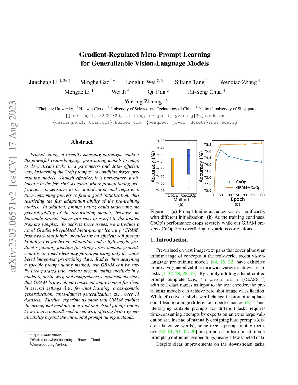 Prompt tuning, a recently emerging paradigm, enables the powerful vision-language pre-training models to adapt to downstream tasks in a parameter -- and data -- efficient way, by learning the ``soft prompts'' to condition frozen pre-training models. Though effective, it is particularly problematic in the few-shot scenario, where prompt tuning performance is sensitive to the initialization and requires a time-consuming process to find a good initialization, thus restricting the fast adaptation ability of the pre-training models. In addition, prompt tuning could undermine the generalizability of the pre-training models, because the learnable prompt tokens are easy to overfit to the limited training samples. To address these issues, we introduce a novel Gradient-RegulAted Meta-prompt learning (GRAM) framework that jointly meta-learns an efficient soft prompt initialization for better adaptation and a lightweight gradient regulating function for strong cross-domain generalizability in a meta-learning paradigm using only the unlabeled image-text pre-training data. Rather than designing a specific prompt tuning method, our GRAM can be easily incorporated into various prompt tuning methods in a model-agnostic way, and comprehensive experiments show that GRAM brings about consistent improvement for them in several settings (i.e., few-shot learning, cross-domain generalization, cross-dataset generalization, etc.) over 11 datasets. Further, experiments show that GRAM enables the orthogonal methods of textual and visual prompt tuning to work in a mutually-enhanced way, offering better generalizability beyond the uni-modal prompt tuning methods.