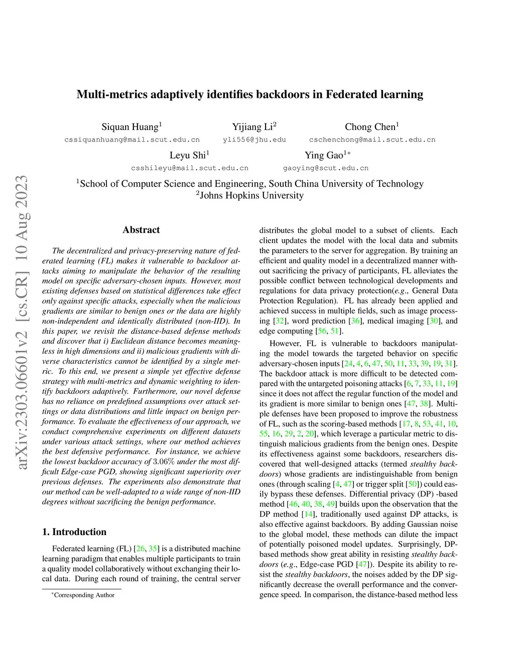 Multi-metrics adaptively identifies backdoors in Federated learning
