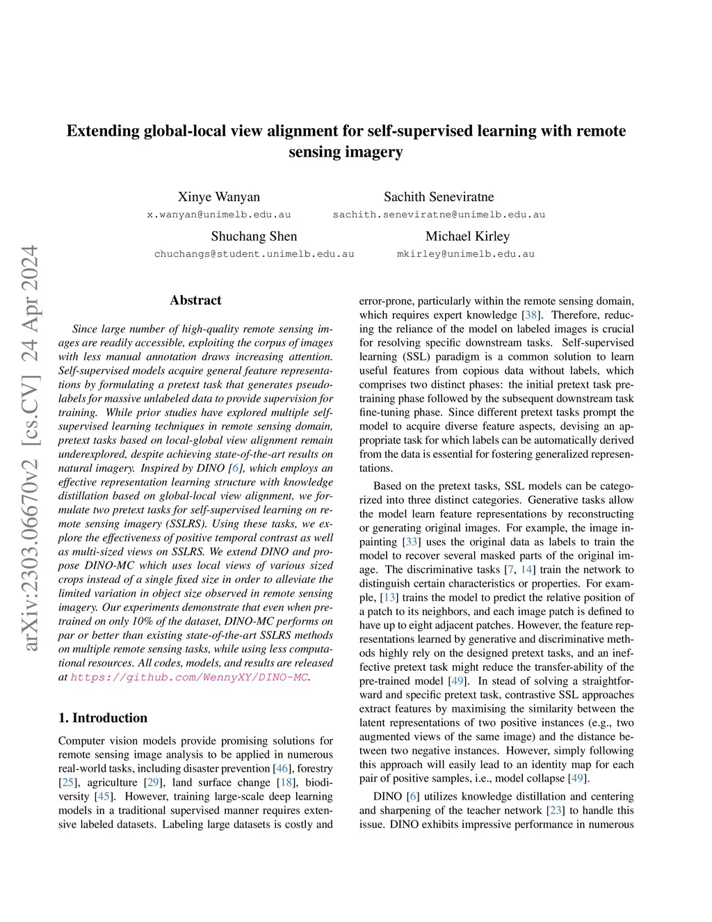 Since large number of high-quality remote sensing images are readily accessible, exploiting the corpus of images with less manual annotation draws increasing attention. Self-supervised models acquire general feature representations by formulating a pretext task that generates pseudo-labels for massive unlabeled data to provide supervision for training. While prior studies have explored multiple self-supervised learning techniques in remote sensing domain, pretext tasks based on local-global view alignment remain underexplored, despite achieving state-of-the-art results on natural imagery. Inspired by DINO, which employs an effective representation learning structure with knowledge distillation based on global-local view alignment, we formulate two pretext tasks for self-supervised learning on remote sensing imagery (SSLRS). Using these tasks, we explore the effectiveness of positive temporal contrast as well as multi-sized views on SSLRS. We extend DINO and propose DINO-MC which uses local views of various sized crops instead of a single fixed size in order to alleviate the limited variation in object size observed in remote sensing imagery. Our experiments demonstrate that even when pre-trained on only 10% of the dataset, DINO-MC performs on par or better than existing state-of-the-art SSLRS methods on multiple remote sensing tasks, while using less computational resources. All codes, models, and results are released at https://github.com/WennyXY/DINO-MC.