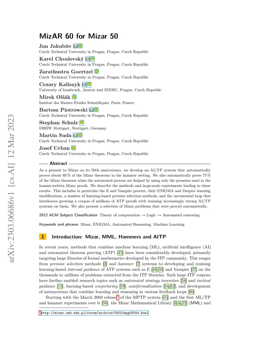As a present to Mizar on its 50th anniversary, we develop an AI/TP system that automatically proves about 60\% of the Mizar theorems in the hammer setting. We also automatically prove 75\% of the Mizar theorems when the automated provers are helped by using only the premises used in the human-written Mizar proofs. We describe the methods and large-scale experiments leading to these results. This includes in particular the E and Vampire provers, their ENIGMA and Deepire learning modifications, a number of learning-based premise selection methods, and the incremental loop that interleaves growing a corpus of millions of ATP proofs with training increasingly strong AI/TP systems on them. We also present a selection of Mizar problems that were proved automatically.
