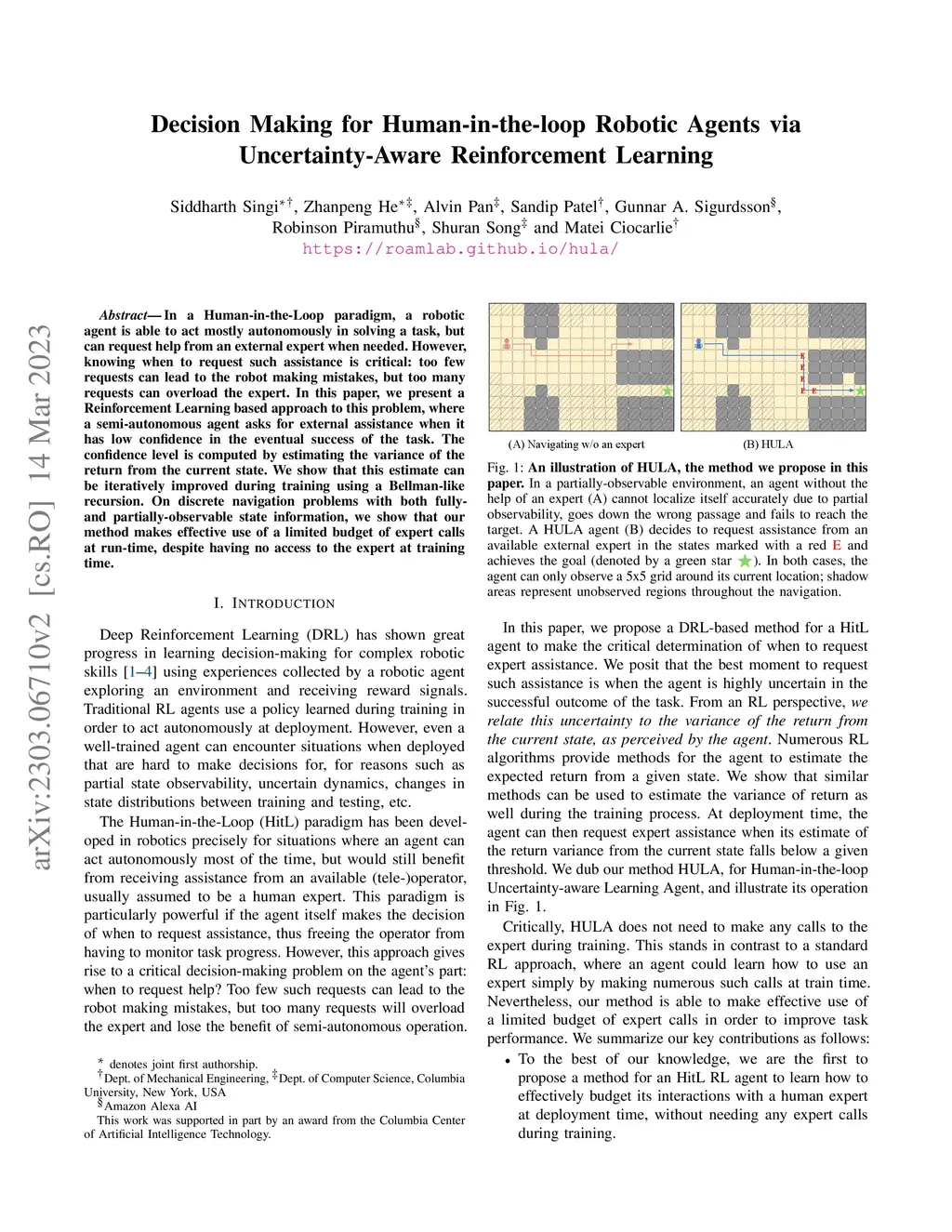 In a Human-in-the-Loop paradigm, a robotic agent is able to act mostly autonomously in solving a task, but can request help from an external expert when needed. However, knowing when to request such assistance is critical: too few requests can lead to the robot making mistakes, but too many requests can overload the expert. In this paper, we present a Reinforcement Learning based approach to this problem, where a semi-autonomous agent asks for external assistance when it has low confidence in the eventual success of the task. The confidence level is computed by estimating the variance of the return from the current state. We show that this estimate can be iteratively improved during training using a Bellman-like recursion. On discrete navigation problems with both fully- and partially-observable state information, we show that our method makes effective use of a limited budget of expert calls at run-time, despite having no access to the expert at training time.