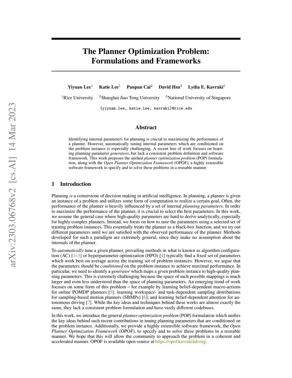 Identifying internal parameters for planning is crucial to maximizing the performance of a planner. However, automatically tuning internal parameters which are conditioned on the problem instance is especially challenging. A recent line of work focuses on learning planning parameter generators, but lack a consistent problem definition and software framework. This work proposes the unified planner optimization problem (POP) formulation, along with the Open Planner Optimization Framework (OPOF), a highly extensible software framework to specify and to solve these problems in a reusable manner.