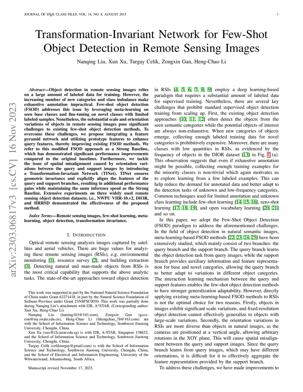 Transformation-Invariant Network for Few-Shot Object Detection in Remote