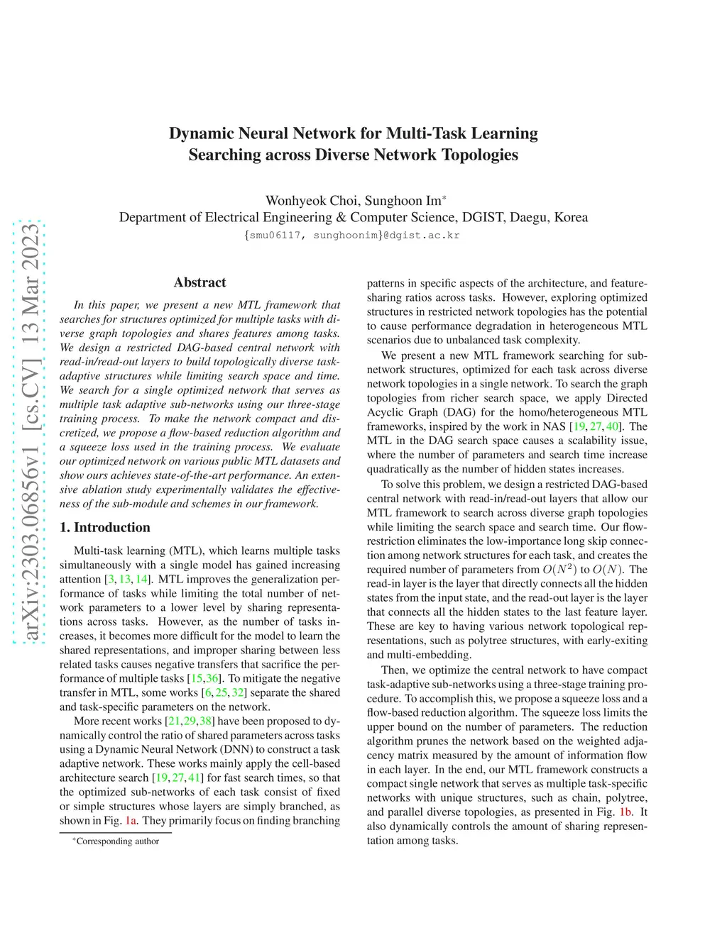 In this paper, we present a new MTL framework that searches for structures optimized for multiple tasks with diverse graph topologies and shares features among tasks. We design a restricted DAG-based central network with read-in/read-out layers to build topologically diverse task-adaptive structures while limiting search space and time. We search for a single optimized network that serves as multiple task adaptive sub-networks using our three-stage training process. To make the network compact and discretized, we propose a flow-based reduction algorithm and a squeeze loss used in the training process. We evaluate our optimized network on various public MTL datasets and show ours achieves state-of-the-art performance. An extensive ablation study experimentally validates the effectiveness of the sub-module and schemes in our framework.