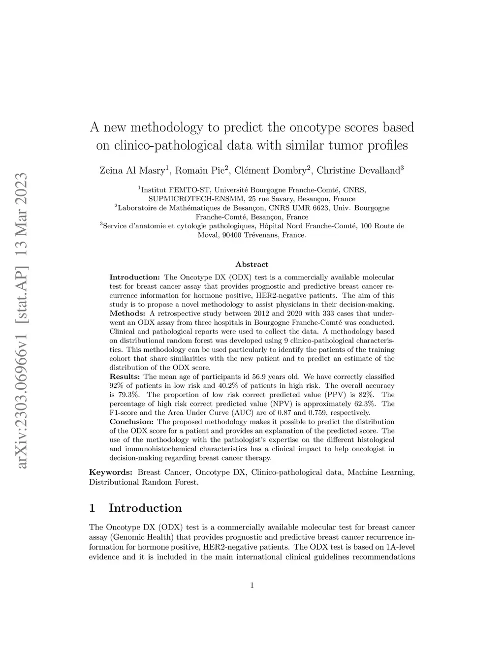Introduction: The Oncotype DX (ODX) test is a commercially available molecular test for breast cancer assay that provides prognostic and predictive breast cancer recurrence information for hormone positive, HER2-negative patients. The aim of this study is to propose a novel methodology to assist physicians in their decision-making. Methods: A retrospective study between 2012 and 2020 with 333 cases that underwent an ODX assay from three hospitals in Bourgogne Franche-Comt{\é} was conducted. Clinical and pathological reports were used to collect the data. A methodology based on distributional random forest was developed using 9 clinico-pathological characteristics. This methodology can be used particularly to identify the patients of the training cohort that share similarities with the new patient and to predict an estimate of the distribution of the ODX score. Results: The mean age of participants id 56.9 years old. We have correctly classified 92% of patients in low risk and 40.2% of patients in high risk. The overall accuracy is 79.3%. The proportion of low risk correct predicted value (PPV) is 82%. The percentage of high risk correct predicted value (NPV) is approximately 62.3%. The F1-score and the Area Under Curve (AUC) are of 0.87 and 0.759, respectively. Conclusion: The proposed methodology makes it possible to predict the distribution of the ODX score for a patient and provides an explanation of the predicted score. The use of the methodology with the pathologist's expertise on the different histological and immunohistochemical characteristics has a clinical impact to help oncologist in decision-making regarding breast cancer therapy.