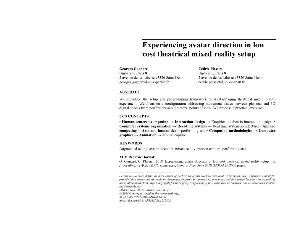 We introduce the setup and programming framework of AvatarStaging theatrical mixed reality experiment. We focus on a configuration addressing movement issues between physical and 3D digital spaces from performers and directors' points of view. We propose 3 practical exercises.