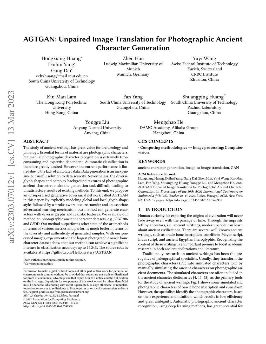 AGTGAN: Unpaired Image Translation for Photographic Ancient Character