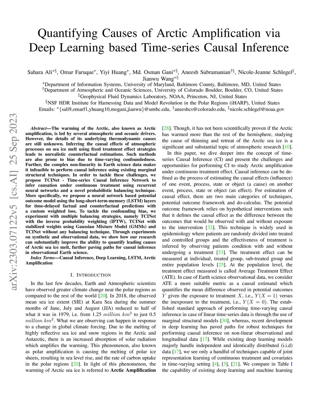 The warming of the Arctic, also known as Arctic amplification, is led by several atmospheric and oceanic drivers. However, the details of its underlying thermodynamic causes are still unknown. Inferring the causal effects of atmospheric processes on sea ice melt using fixed treatment effect strategies leads to unrealistic counterfactual estimations. Such models are also prone to bias due to time-varying confoundedness. Further, the complex non-linearity in Earth science data makes it infeasible to perform causal inference using existing marginal structural techniques. In order to tackle these challenges, we propose TCINet - time-series causal inference model to infer causation under continuous treatment using recurrent neural networks and a novel probabilistic balancing technique. Through experiments on synthetic and observational data, we show how our research can substantially improve the ability to quantify leading causes of Arctic sea ice melt, further paving paths for causal inference in observational Earth science.