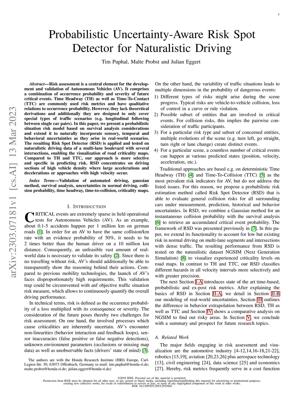 Risk assessment is a central element for the development and validation of Autonomous Vehicles (AV). It comprises a combination of occurrence probability and severity of future critical events. Time Headway (TH) as well as Time-To-Contact (TTC) are commonly used risk metrics and have qualitative relations to occurrence probability. However, they lack theoretical derivations and additionally they are designed to only cover special types of traffic scenarios (e.g. following between single car pairs). In this paper, we present a probabilistic situation risk model based on survival analysis considerations and extend it to naturally incorporate sensory, temporal and behavioral uncertainties as they arise in real-world scenarios. The resulting Risk Spot Detector (RSD) is applied and tested on naturalistic driving data of a multi-lane boulevard with several intersections, enabling the visualization of road criticality maps. Compared to TH and TTC, our approach is more selective and specific in predicting risk. RSD concentrates on driving sections of high vehicle density where large accelerations and decelerations or approaches with high velocity occur.