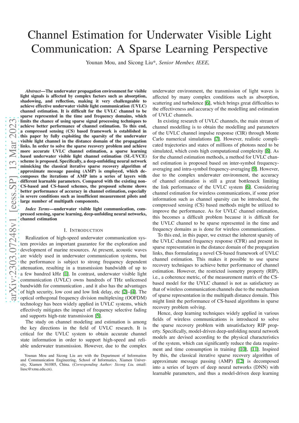 The underwater propagation environment for visible light signals is affected by complex factors such as absorption, shadowing, and reflection, making it very challengeable to achieve effective underwater visible light communication (UVLC) channel estimation. It is difficult for the UVLC channel to be sparse represented in the time and frequency domains, which limits the chance of using sparse signal processing techniques to achieve better performance of channel estimation. To this end, a compressed sensing (CS) based framework is established in this paper by fully exploiting the sparsity of the underwater visible light channel in the distance domain of the propagation links. In order to solve the sparse recovery problem and achieve more accurate UVLC channel estimation, a sparse learning based underwater visible light channel estimation (SL-UVCE) scheme is proposed. Specifically, a deep-unfolding neural network mimicking the classical iterative sparse recovery algorithm of approximate message passing (AMP) is employed, which decomposes the iterations of AMP into a series of layers with different learnable parameters. Compared with the existing non-CS-based and CS-based schemes, the proposed scheme shows better performance of accuracy in channel estimation, especially in severe conditions such as insufficient measurement pilots and large number of multipath components.