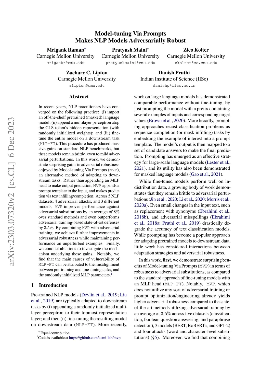 Model-tuning Via Prompts Makes NLP Models Adversarially Robust