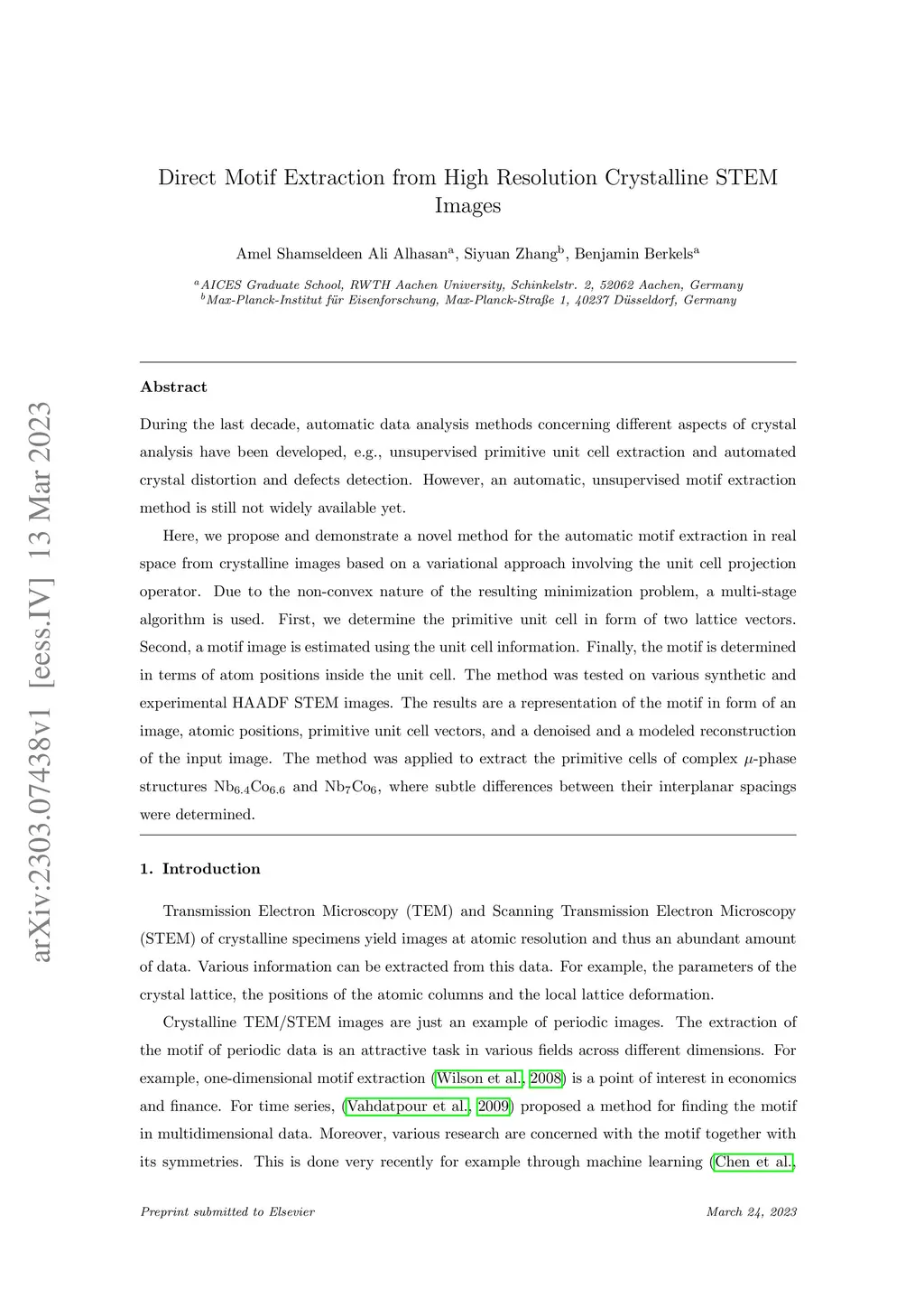 During the last decade, automatic data analysis methods concerning different aspects of crystal analysis have been developed, e.g., unsupervised primitive unit cell extraction and automated crystal distortion and defects detection. However, an automatic, unsupervised motif extraction method is still not widely available yet. Here, we propose and demonstrate a novel method for the automatic motif extraction in real space from crystalline images based on a variational approach involving the unit cell projection operator. Due to the non-convex nature of the resulting minimization problem, a multi-stage algorithm is used. First, we determine the primitive unit cell in form of two lattice vectors. Second, a motif image is estimated using the unit cell information. Finally, the motif is determined in terms of atom positions inside the unit cell. The method was tested on various synthetic and experimental HAADF STEM images. The results are a representation of the motif in form of an image, atomic positions, primitive unit cell vectors, and a denoised and a modeled reconstruction of the input image. The method was applied to extract the primitive cells of complex -phase structures NbCo and NbCo, where subtle differences between their interplanar spacings were determined.